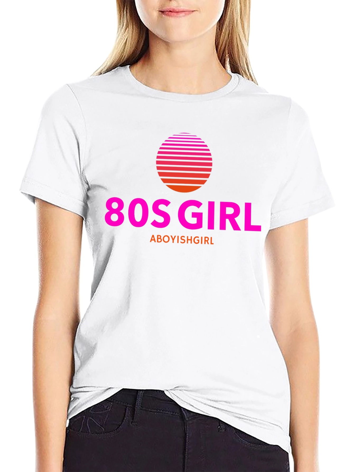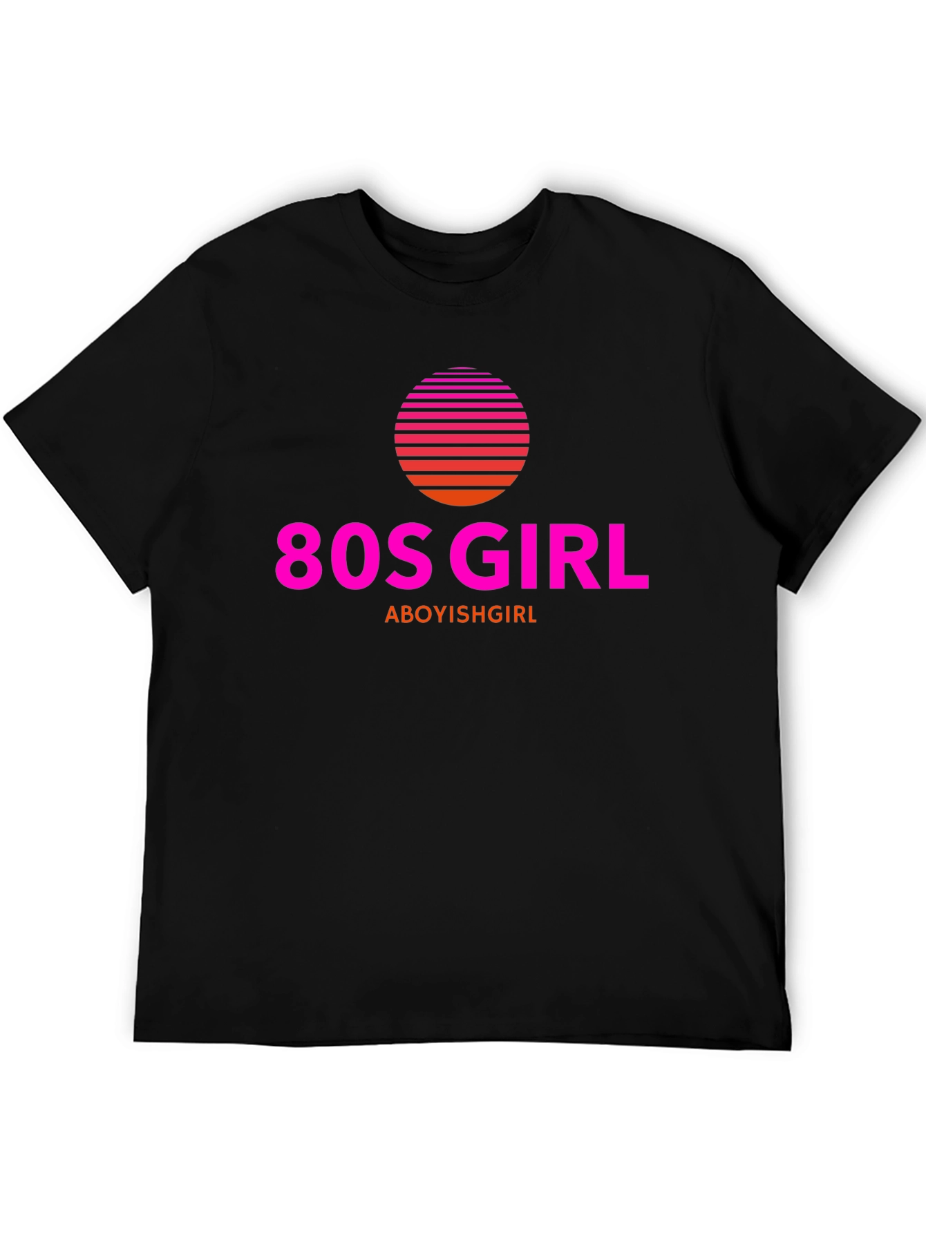 Step back in time with this vintage-inspired "80s Girl" graphic t-shirt. Featuring a classic black backdrop, the vibrant design pops with a retro sunset and bold pink lettering. Below, "ABOYISHGIRL" is written in a smaller, orange font. Made from comfortable and breathable fabric, this tee is perfect for everyday wear. Show off your unique style at casual outings, concerts, or simply lounging at home. This eye-catching piece is a must-have for anyone who loves retro fashion and wants to make a statement. Embrace the nostalgia and add a touch of 80s flair to your wardrobe!