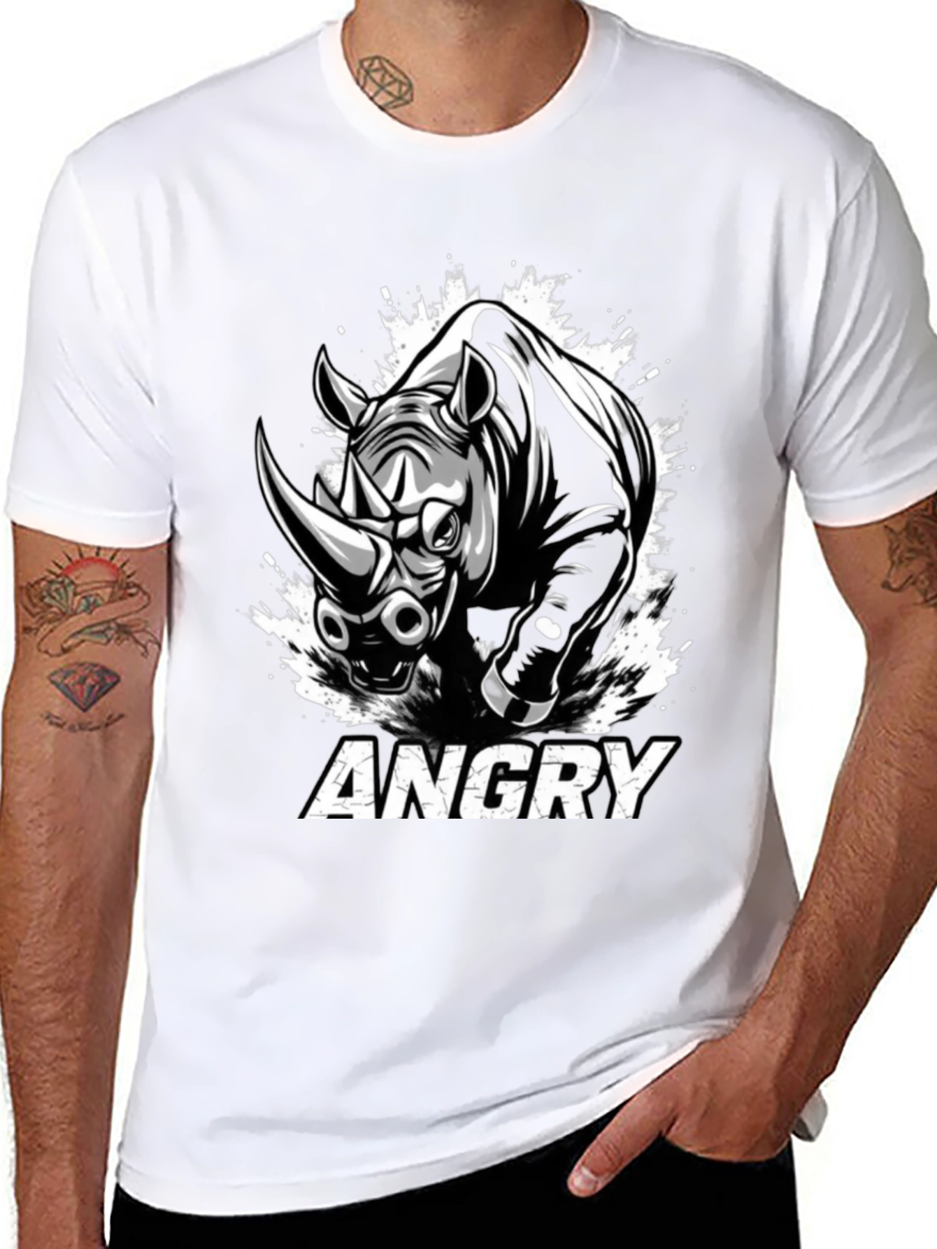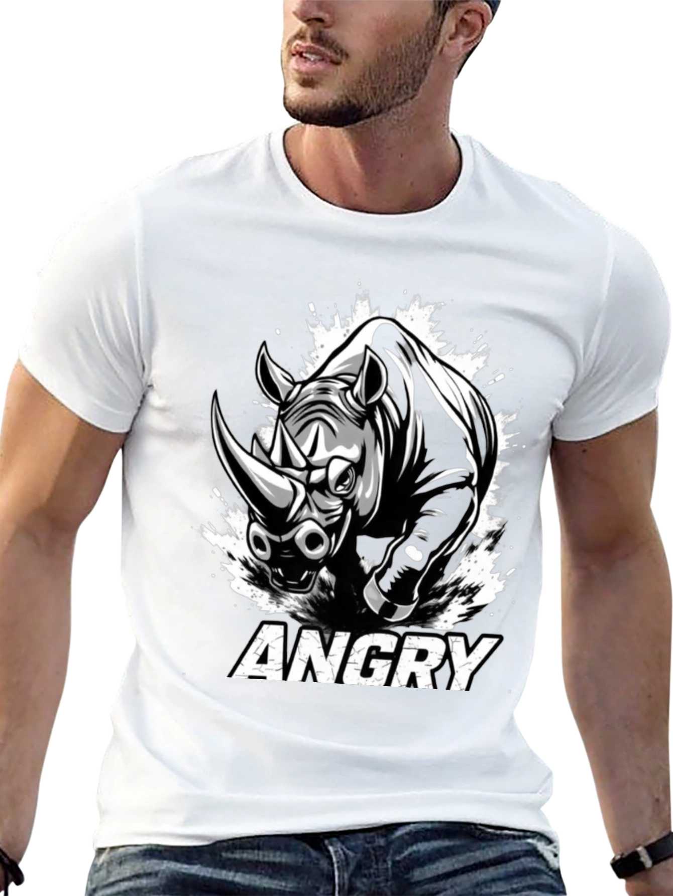 Showcase your wild side with this striking men's black t-shirt! This tee features a bold graphic of an angry, charging rhino rendered in high-contrast black and white. The word "ANGRY" is printed below the rhino in a strong, impactful font, completing the design. Made from what appears to be soft, breathable cotton, this tee offers both style and comfort. Its classic fit makes it perfect for everyday wear, casual outings, or making a statement. Pair it with jeans, shorts, or your favorite streetwear for a look that's both edgy and comfortable. Add this unique piece to your wardrobe and unleash your inner animal!