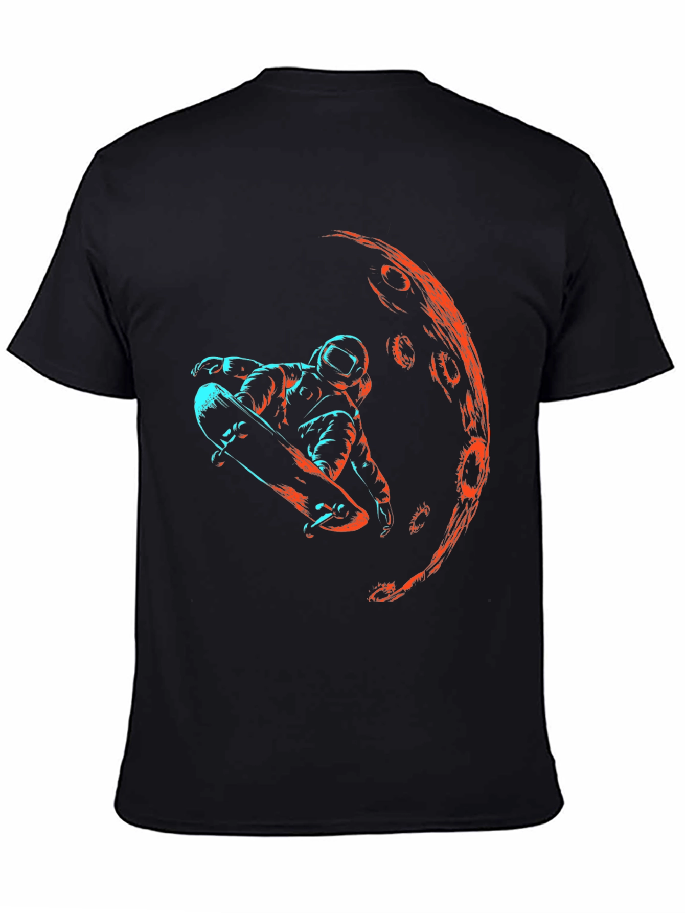 Show off your unique style with this eye-catching black t-shirt featuring an astronaut skateboarding in front of a stylized moon. The vibrant color contrast makes the design pop, creating a modern and edgy look. Made from a comfortable cotton blend, this tee is perfect for everyday wear. The graphic print is unique and visually striking. Wear this tee to casual hangouts, concerts, or while cruising around town on your own skateboard! Makes a great gift for space and skateboarding enthusiasts.