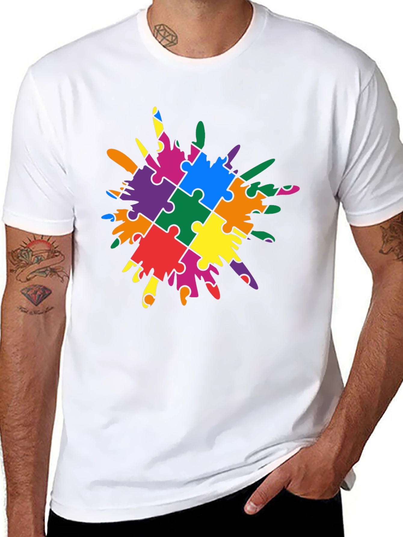 Show your support with this striking black t-shirt featuring a vibrant, colorful puzzle piece design. The eye-catching graphic showcases interlocking puzzle pieces in a splatter effect, symbolizing autism awareness and acceptance. Made from a comfortable, breathable fabric, this tee is perfect for everyday wear and spreading a positive message. Ideal for autism awareness events, casual outings, or as a thoughtful gift. Let your style speak volumes with this meaningful and fashionable statement piece.