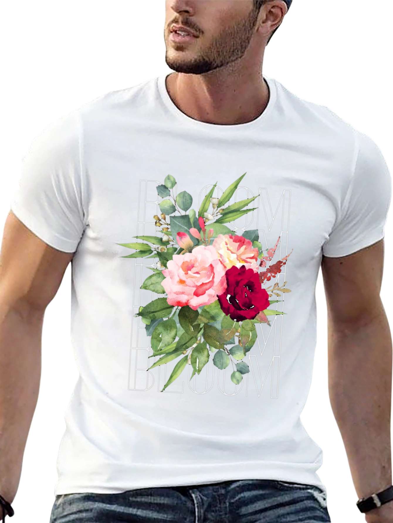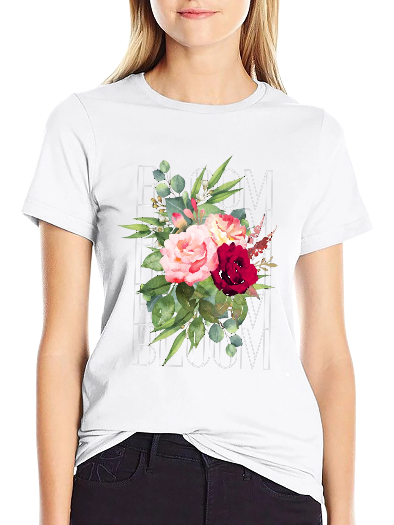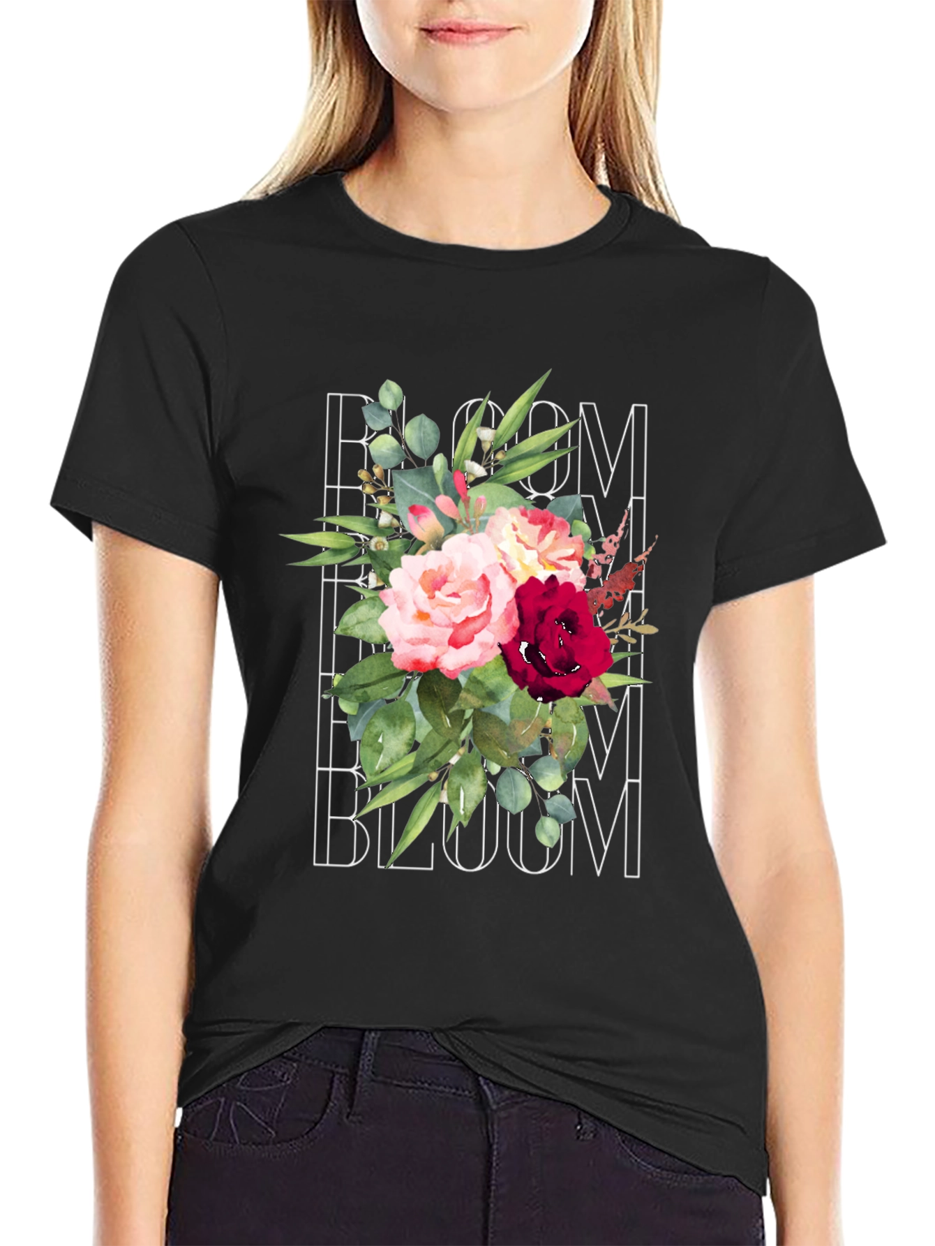 This classic black t-shirt features a vibrant and eye-catching floral graphic. The design showcases a beautiful arrangement of roses and eucalyptus leaves, overlaid with the word "Bloom". The soft, comfortable fabric makes it ideal for everyday wear. The timeless design offers effortless style that pairs well with jeans, shorts, or chinos. Perfect for casual outings, weekend wear, or adding a touch of nature-inspired charm to your wardrobe. A stylish and comfortable piece that allows you to showcase your unique personality.