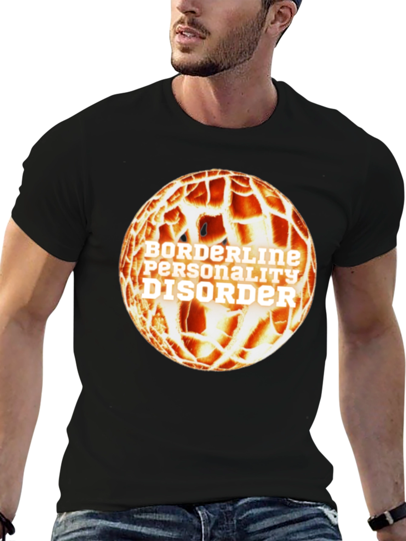 Show your support with this unique Borderline Personality Disorder graphic t-shirt. The black tee features a striking orange and white design resembling a fractured globe, with the text "BORDERLINE PERSONALITY DISORDER" emblazoned across the center. Made from what appears to be a comfortable cotton blend, this short-sleeved shirt is perfect for casual wear, awareness events, or simply making a statement. The bold graphic is sure to catch the eye and spark conversations. Wear your support proudly and help raise awareness with this eye-catching tee. A perfect gift to show love and compassion.