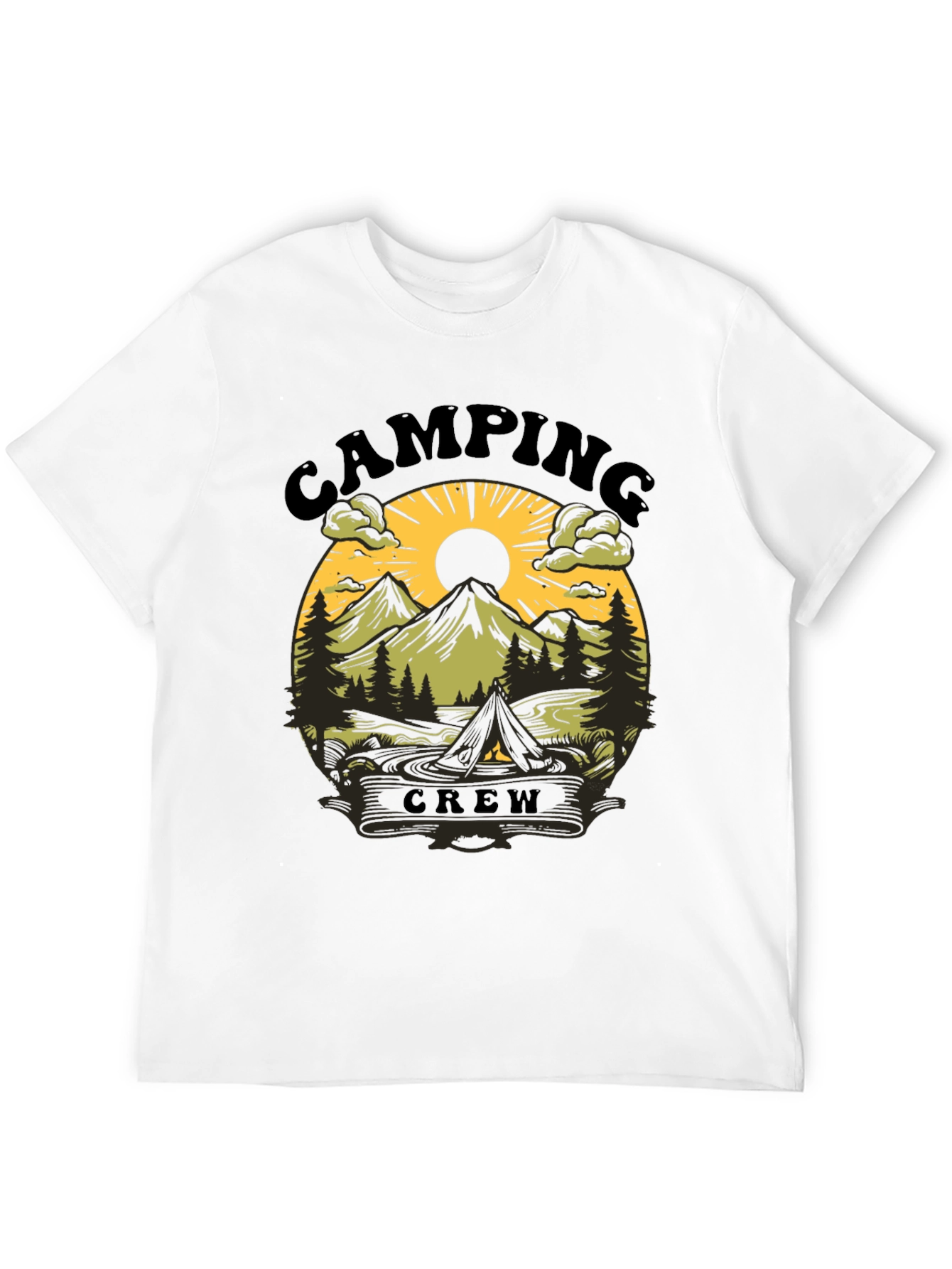 Show off your love for the great outdoors with this Camping Crew graphic tee. The design features a vintage-inspired graphic of mountains, trees, and a tent, all set within a circular sunburst design. The words "CAMPING CREW" are printed in bold letters above and below the central image. Made from a comfortable cotton blend, this tee is perfect for casual wear or your next camping trip. This is a cool tee for outdoor enthusiasts and adventure seekers alike. Grab this stylish tee today and let your love for camping shine!