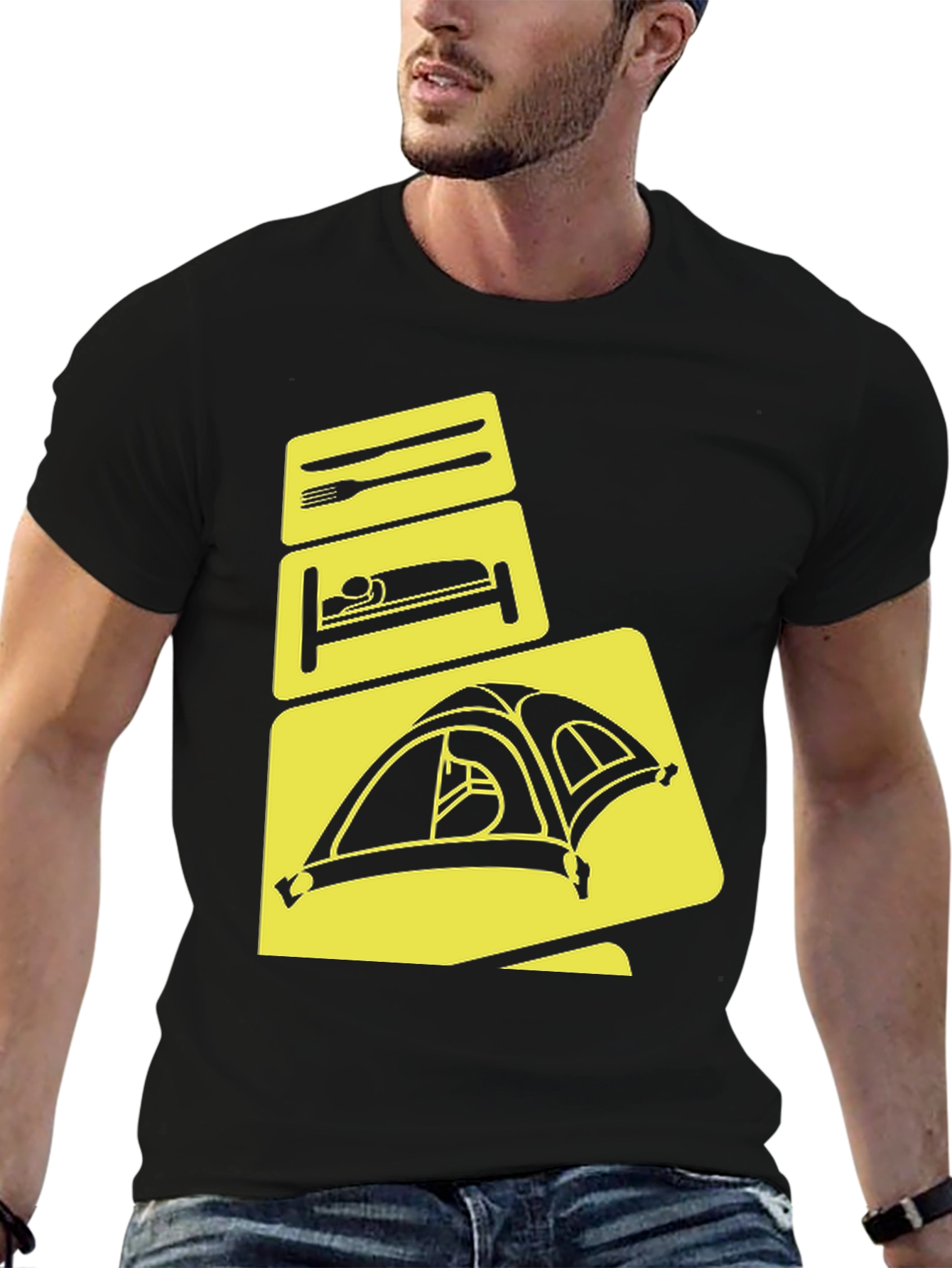 Showcase your love for the outdoors with this unique black t-shirt. The shirt features a yellow graphic design with camping essentials: dining, sleeping, and a tent, stacked for a cool repeat effect. Made from a comfortable, breathable fabric, this casual wear is perfect for everyday adventures, camping trips, or just relaxing at home. A perfect gift for outdoor enthusiasts or anyone who loves the camping lifestyle. Stand out with this eye-catching design that is sure to spark conversation.