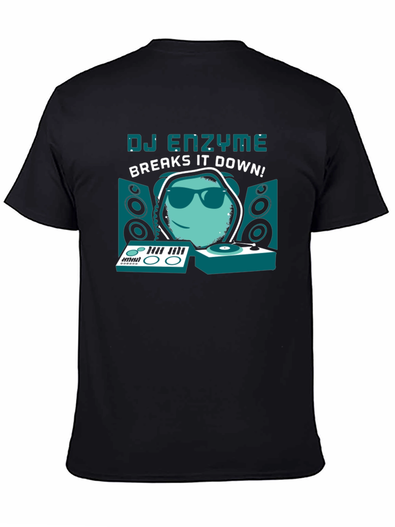 Rock the beat with this unique DJ Enzyme graphic tee! This black t-shirt features a playful, cartoon-style design of a DJ character with headphones and sunglasses, surrounded by speakers and DJ equipment. The vibrant teal and white graphics pop against the dark background, creating an eye-catching and stylish look. Made from a comfortable, breathable fabric, this tee is perfect for casual wear, music events, or showing off your love for electronic music. Make a statement and let everyone know you're ready to break it down with this fun and trendy t-shirt.