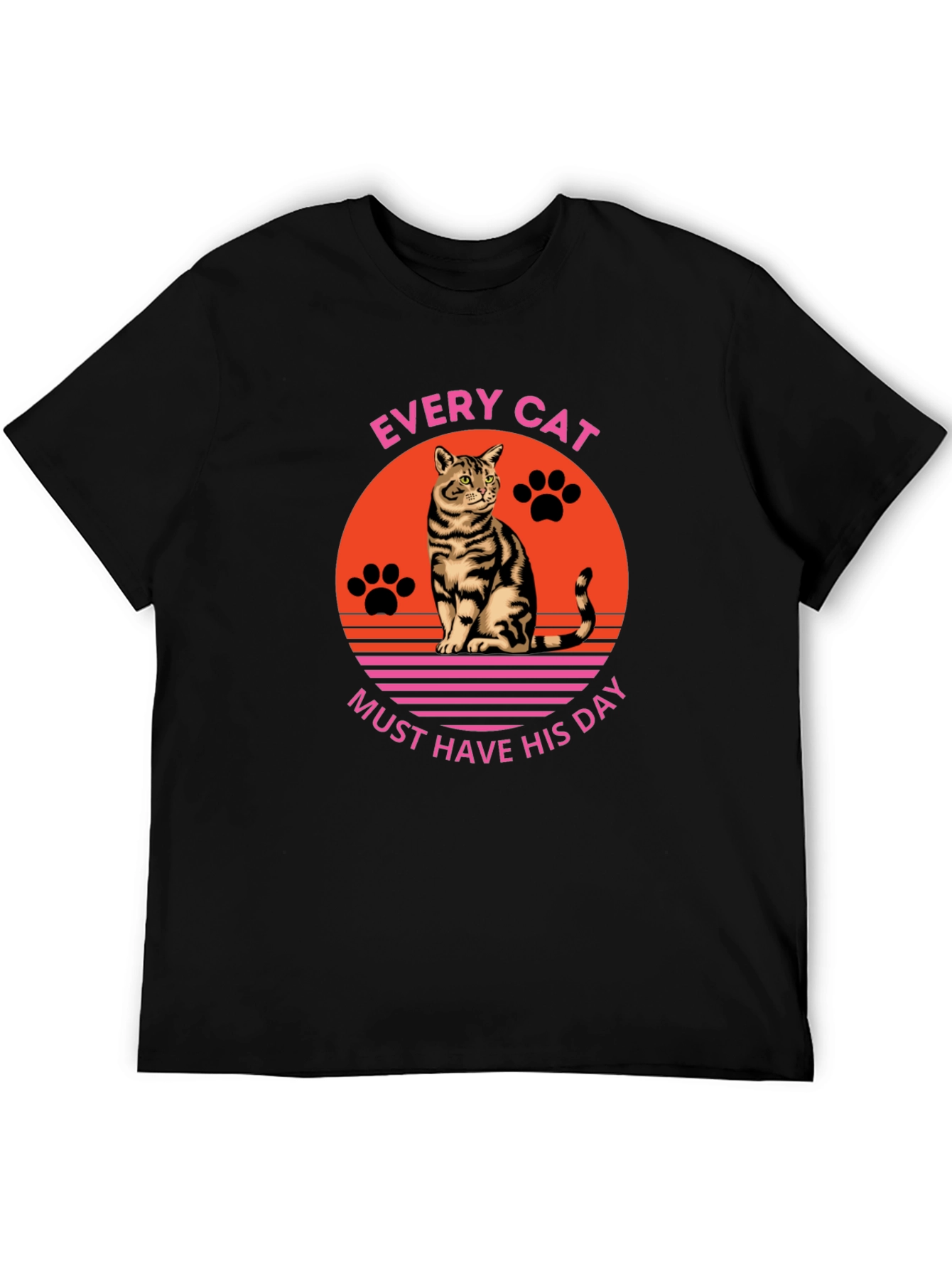 Show your love for cats with this stylish black T-shirt. Featuring a retro-inspired design with a tabby cat graphic against an orange sunset backdrop, complete with pink stripes and paw prints. The playful slogan "Every Cat Must Have His Day" adds a touch of whimsy. Made from a soft and comfortable fabric, this tee is perfect for everyday wear. Ideal for cat lovers and anyone who enjoys unique, eye-catching apparel. Makes a great gift for birthdays or holidays. Wear it to the park, vet visit, or while relaxing at home with your feline friend.