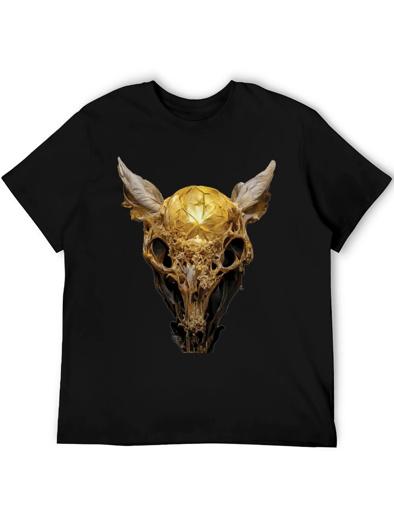 Showcase your unique style with this eye-catching black t-shirt featuring a detailed golden skull graphic. The intricate design gives it a gothic feel and it is printed on a soft, comfortable cotton fabric. It will stand out from the crowd, this t-shirt is perfect for casual wear, concerts, or making a statement. A must-have for anyone who appreciates bold, artistic apparel. Pair it with your favorite jeans or shorts for a stylish, effortless look. Available in various sizes, this unique tee is sure to become a wardrobe staple.