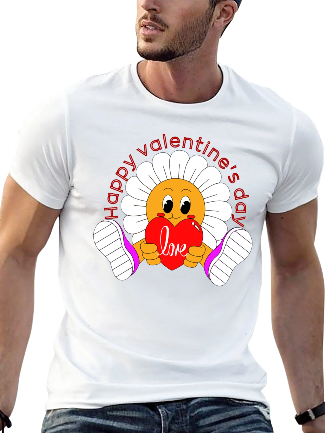 Spread the love with this adorable graphic tee! Featuring a charming flower character holding a heart with 'love' written on it, and the words 'Happy Valentine's Day,' this tee is perfect for celebrating the season of romance. The design is printed on a soft, comfortable black fabric. Its versatile style makes it suitable for casual outings, parties, or even just lounging at home. Show off your fun and festive side with this Valentine's Day must-have. It will definitely bring a smile to everyone's face. Get yours now and share the love!