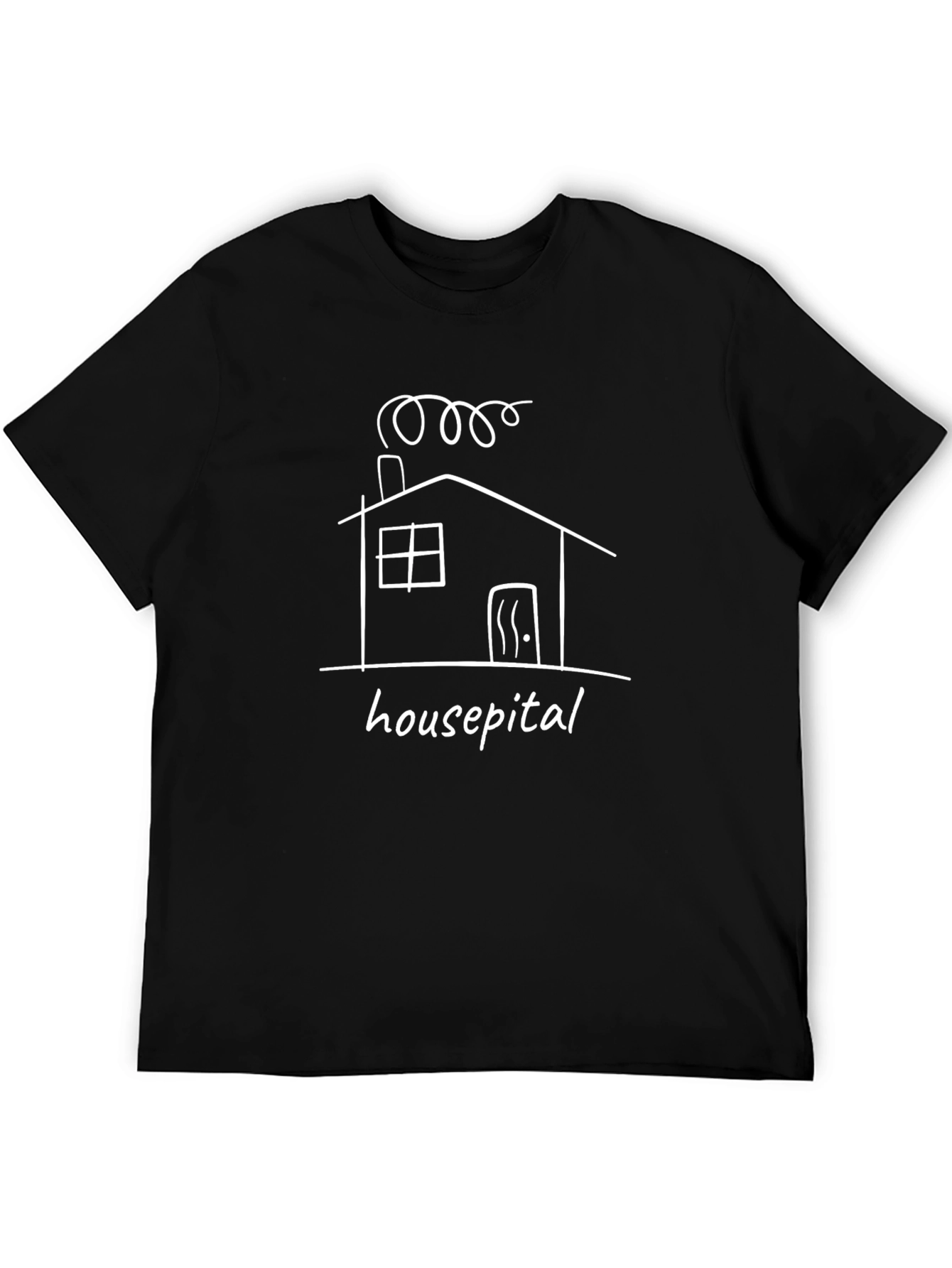 Show off your playful side with this black graphic tee. This shirt features a unique and quirky "housepital" design with a simple, hand-drawn style house graphic. Made from a comfortable fabric, it's perfect for casual wear. The whimsical design makes it a great conversation starter and a fun addition to any wardrobe. Great for everyday use, pair it with jeans or shorts for a relaxed look. Stand out with this unique and fun shirt!