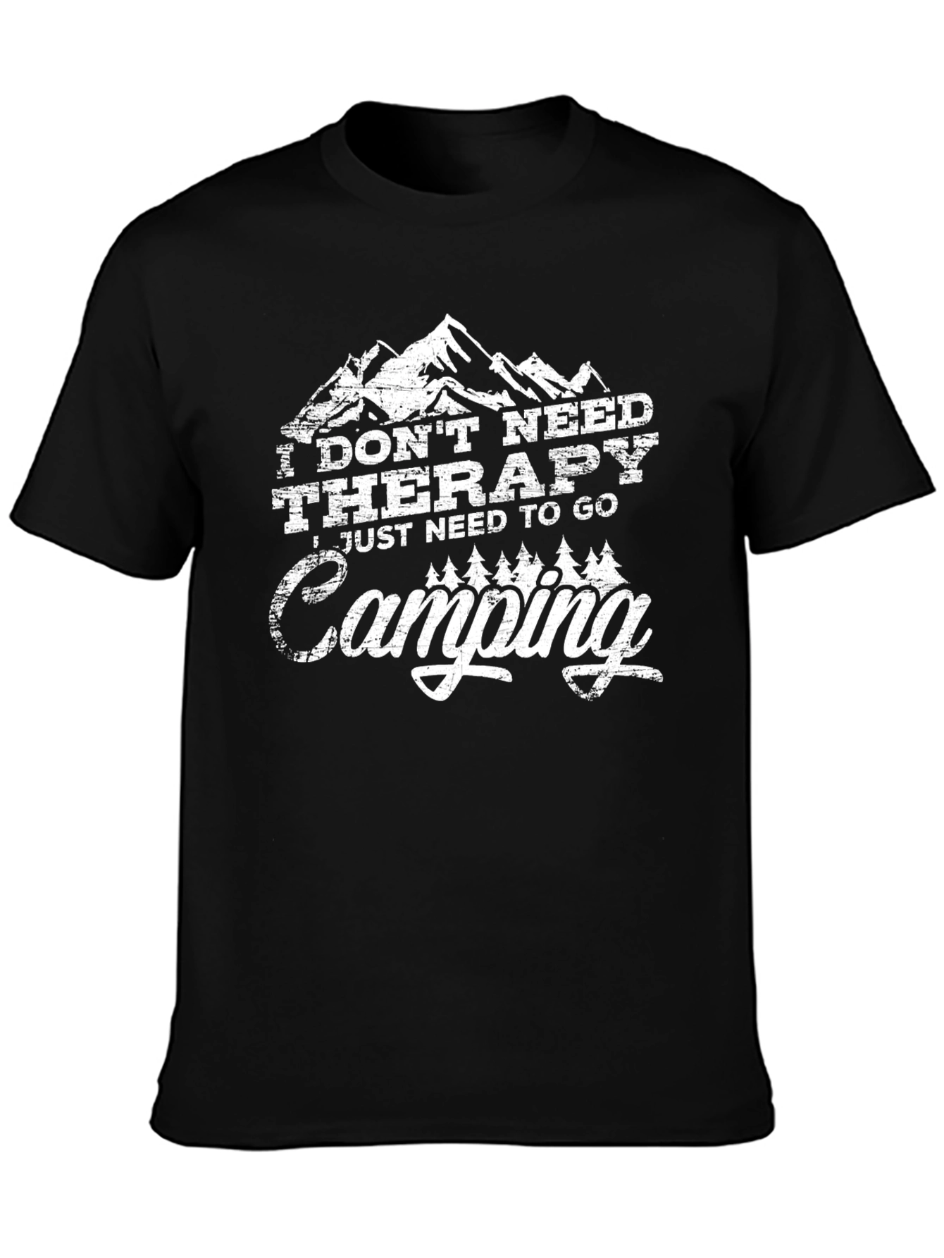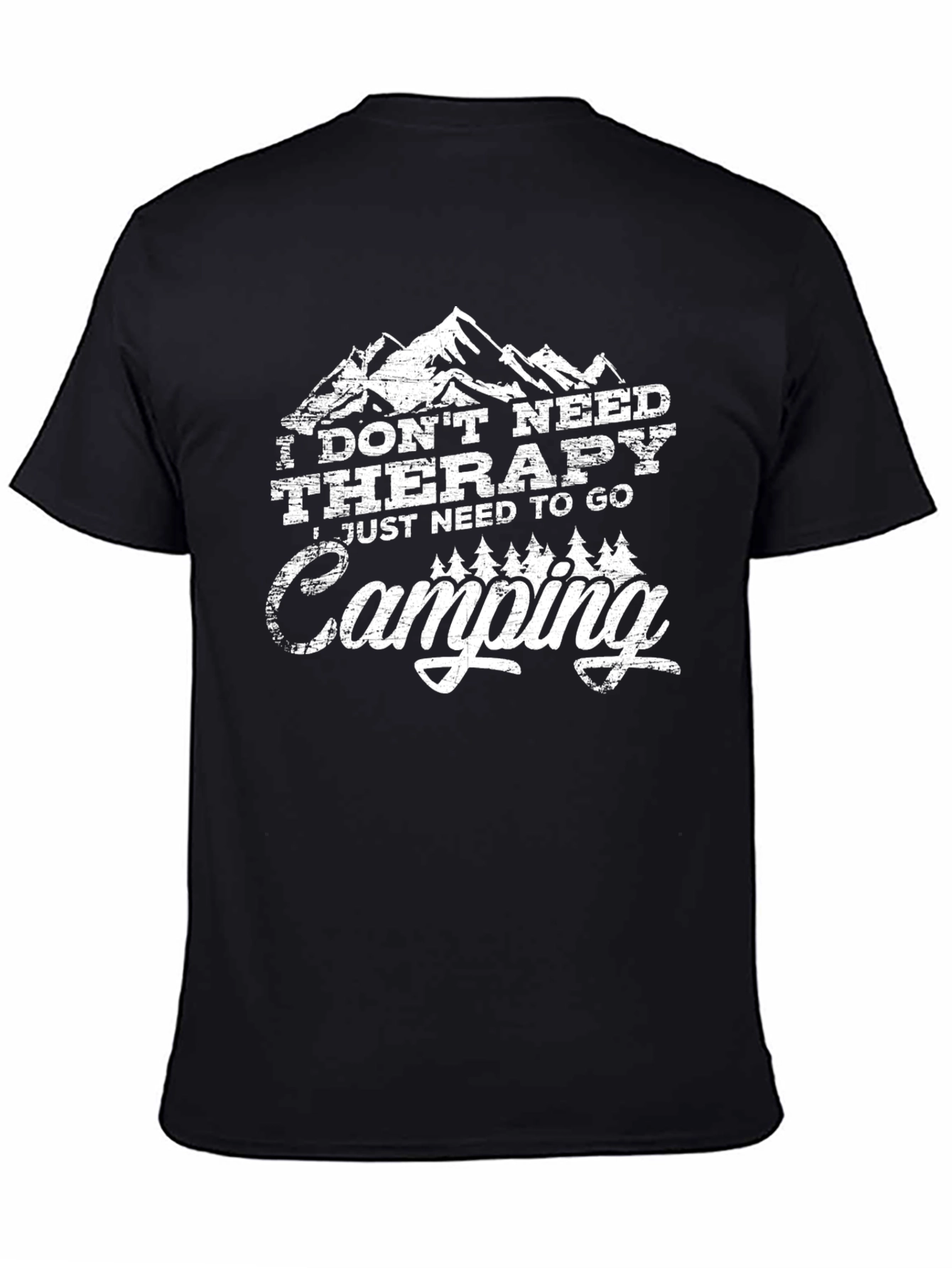 This black t-shirt features a distressed white graphic perfect for the outdoor enthusiast. The design includes a mountain range silhouette above the text 'I DON'T NEED THERAPY I JUST NEED TO GO CAMPING,' interspersed with stylized evergreen trees. The shirt appears to be made of a comfortable cotton blend, making it ideal for casual wear or layering during camping trips. Express your love for nature and a touch of humor with this unique tee. Great for gifting to campers and hikers!