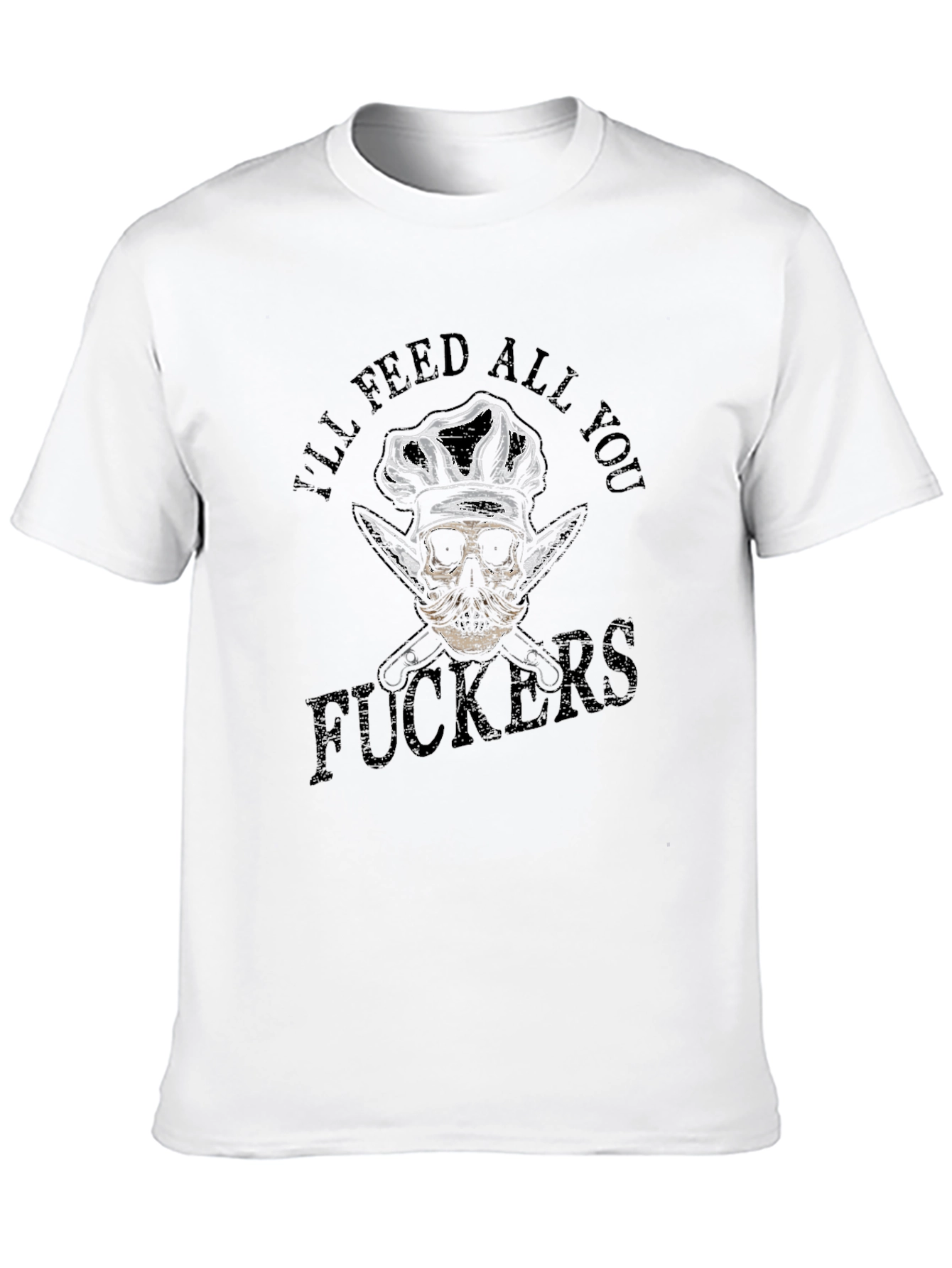 Show off your edgy side with this unique black t-shirt. The shirt features a skull wearing a chef's hat with crossed knives beneath it. Above the skull, the words "I'll Feed All You", and below it, the word "FUCKERS" are printed in a distressed font. The design gives it a bold look. Made from comfortable materials, this tee is perfect for casual wear, cooking enthusiasts, or anyone with a rebellious spirit. Wear it to your next barbecue, cooking event, or night out with friends to make a statement.