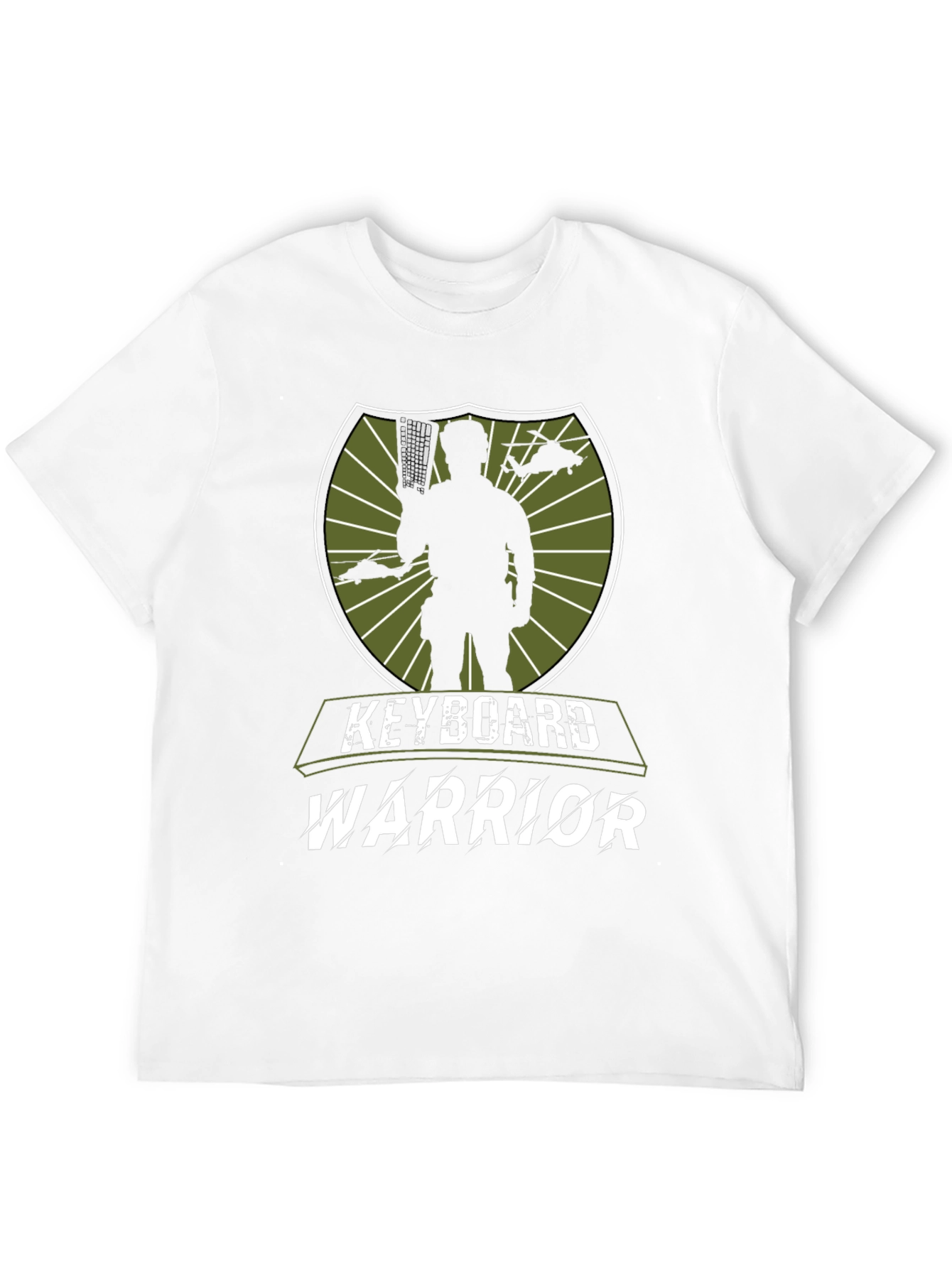 Show off your tech skills with this cool black graphic tee. The shirt features a shield-shaped design with a silhouette of a figure holding a keyboard, along with helicopter graphics. The text "KEYBOARD WARRIOR" is boldly displayed. This shirt is perfect for coders, gamers, or anyone who loves technology. Made from comfortable materials, it's great for everyday wear. A unique and stylish addition to any wardrobe!