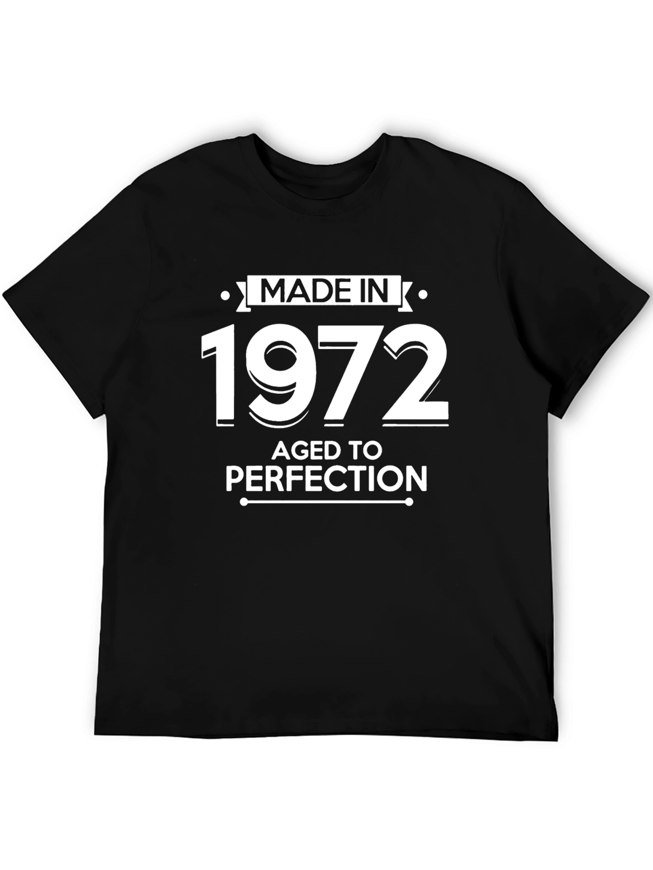 Celebrate a milestone year with this classic black t-shirt featuring the witty phrase "Made in 1972, Aged to Perfection". Crafted from a soft and comfortable fabric, this tee offers both style and comfort. The bold white text stands out against the black background, making a statement wherever you go. This shirt is perfect for birthday celebrations, milestone events, or simply showing off your vintage charm. Its versatile design pairs effortlessly with jeans, shorts, or casual trousers. Make a statement and let everyone know that some things truly do get better with age.