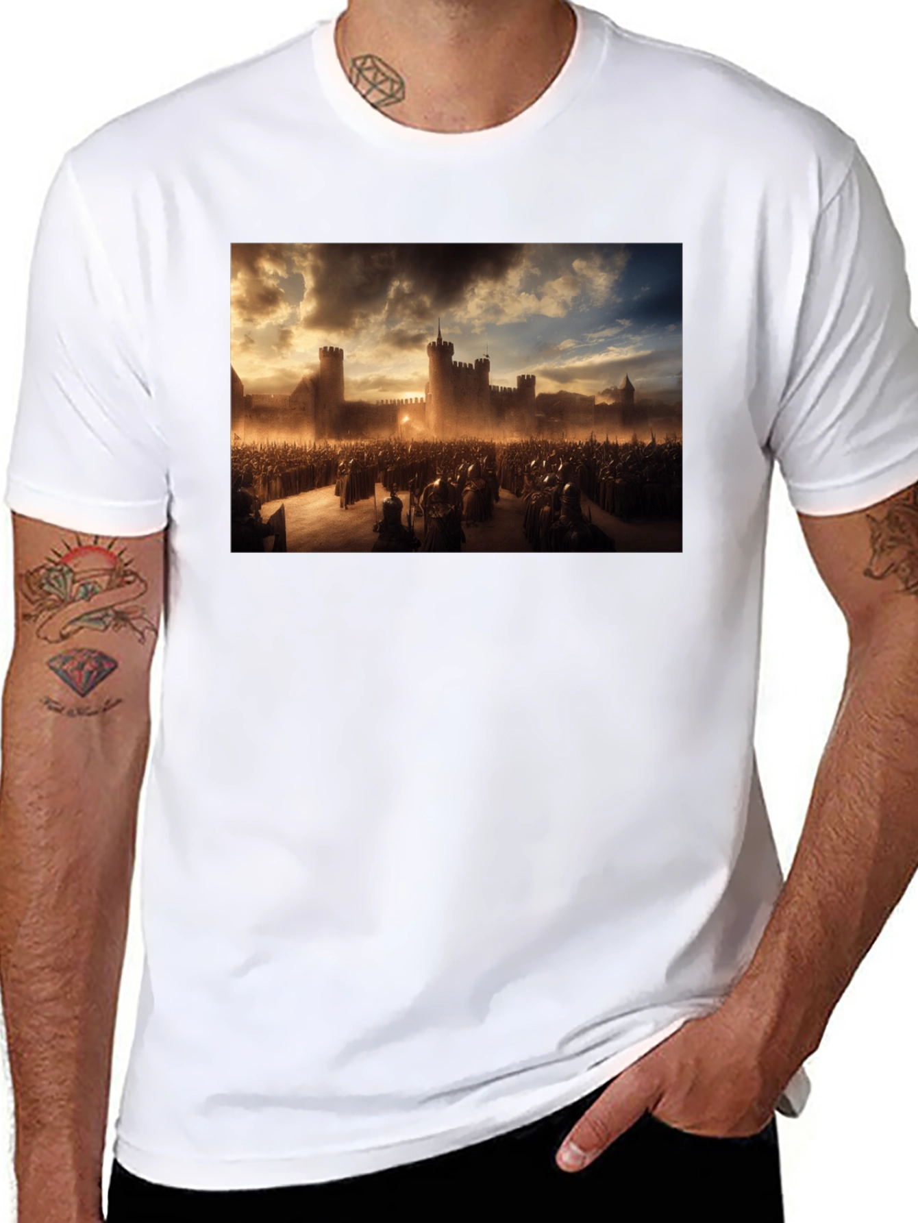 Step into a world of epic battles and ancient fortresses with this striking graphic tee. The shirt features a detailed image of a medieval castle, complete with towering walls and formidable towers. A massive army stands ready before the castle, evoking a sense of historical grandeur and powerful conflict. Made from comfortable, high-quality fabric, this tee is perfect for history buffs, fantasy enthusiasts, or anyone looking to make a bold statement. Wear it casually or pair it with your favorite jacket for a stylish, eye-catching look. Embrace the warrior spirit and show off your unique style with this exceptional graphic tee.