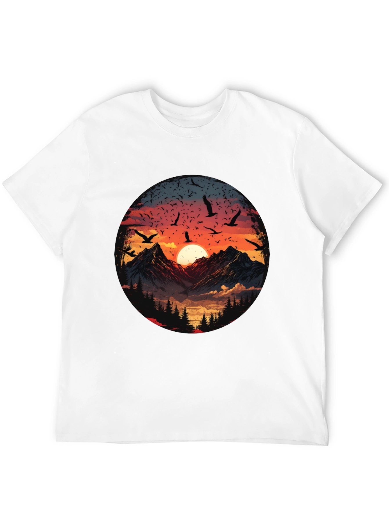 Elevate your wardrobe with this striking black t-shirt featuring a captivating mountain sunset design. The detailed graphic showcases soaring birds silhouetted against a vibrant orange and blue sky, with majestic mountains and lush forests below. Made from a comfortable fabric, this tee offers both style and comfort. Perfect for nature lovers and adventure seekers, this shirt is ideal for casual outings, hiking trips, or simply expressing your love for the great outdoors. Make a statement with this eye-catching and unique t-shirt.