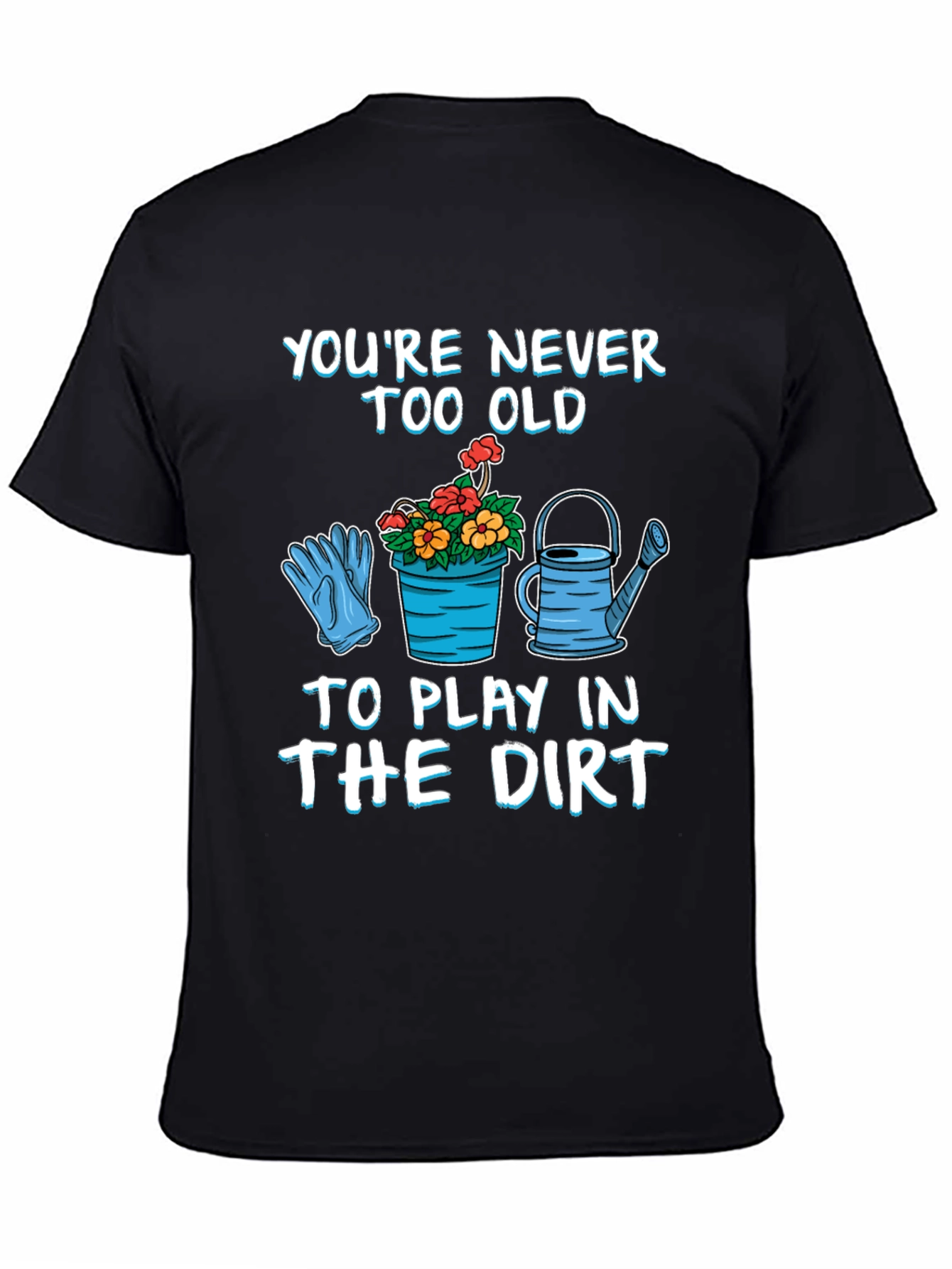 Show off your love for gardening with this fun and playful t-shirt! The black tee features a vibrant graphic with gardening gloves, potted plants, and a watering can. Bold white text proclaims "You're Never Too Old To Play In The Dirt." Made from a comfortable material, this shirt is perfect for wearing while tending your garden or for casual everyday wear. It's an ideal gift for gardeners, retirees, or anyone who loves spending time outdoors. Get yours today!