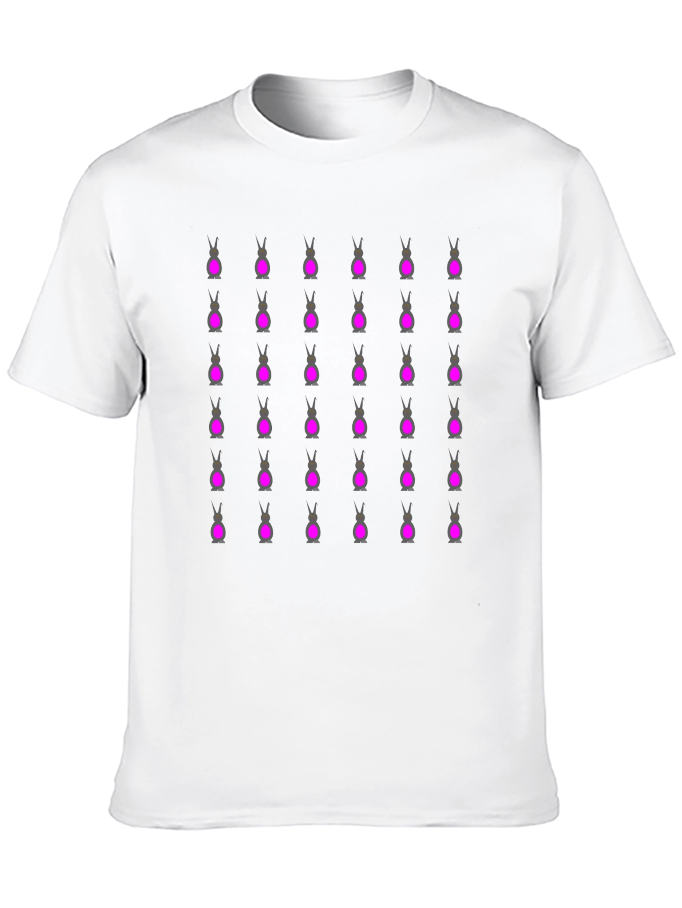 Stand out in this unique black t-shirt featuring a repeating bunny pattern. This eye-catching design adds a touch of whimsy to your everyday style. Made from comfortable, breathable fabric, this tee is perfect for casual wear, social gatherings, or expressing your fun-loving personality. Pair it with jeans, shorts, or a skirt for a versatile look. The bold pattern ensures you'll turn heads wherever you go. A must-have addition to any wardrobe for those who appreciate distinctive fashion.