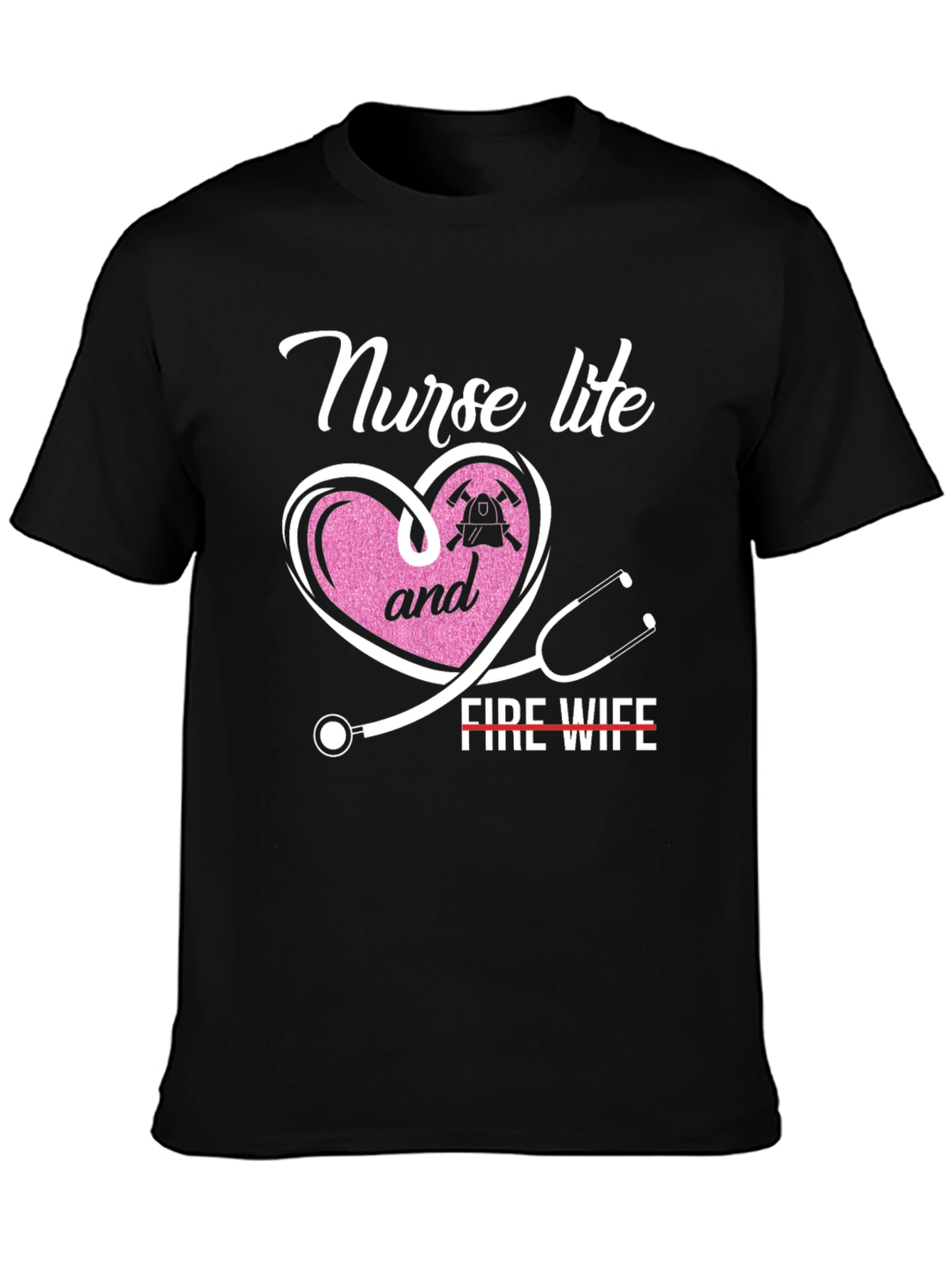 Show your pride with this stylish "Nurse Life and Fire Wife" T-shirt. This black tee features a unique design incorporating a heart shape, a nurse's stethoscope, and crossed-axes for fire fighter image. The words "Nurse Life" are displayed above the heart, connected to the word "and" inside the heart. "Fire Wife" is struck through, hinting at a preference for the nursing profession. Perfect for nurses or anyone who appreciates a clever and meaningful design. Wear it casually or as a conversation starter, making it an essential addition to your wardrobe.