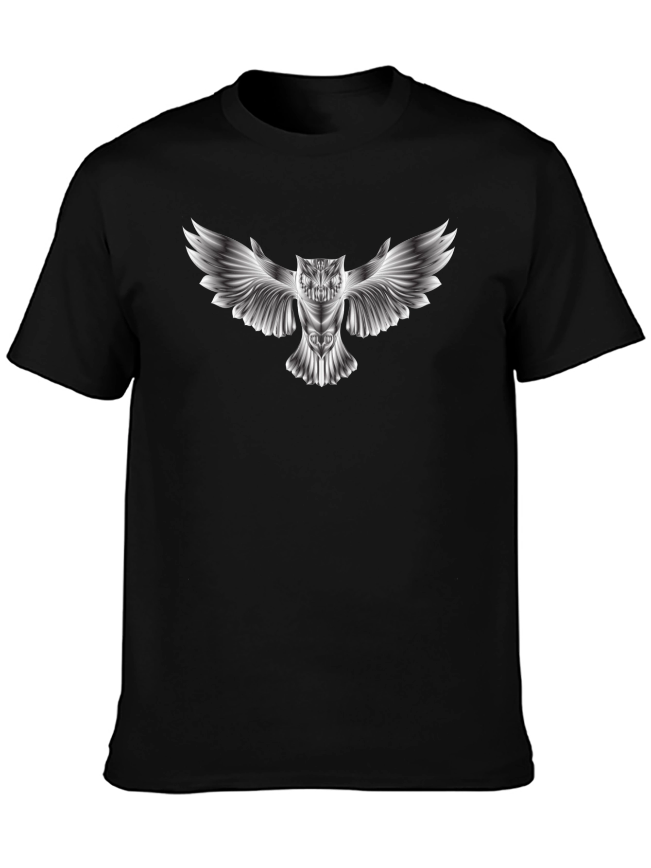 This stylish black t-shirt features a striking silver owl graphic design. The owl is depicted with intricately detailed wings spread wide, creating a bold and eye-catching visual. Made from a comfortable-looking fabric, this tee appears soft and breathable, perfect for everyday wear. The classic crew neck and short sleeves offer a casual fit, making it a versatile addition to any wardrobe. Whether you're going for a relaxed weekend look or want to add some edge to your outfit, this owl graphic tee is an excellent choice. Showcase your unique style and love for wildlife with this stand-out piece.