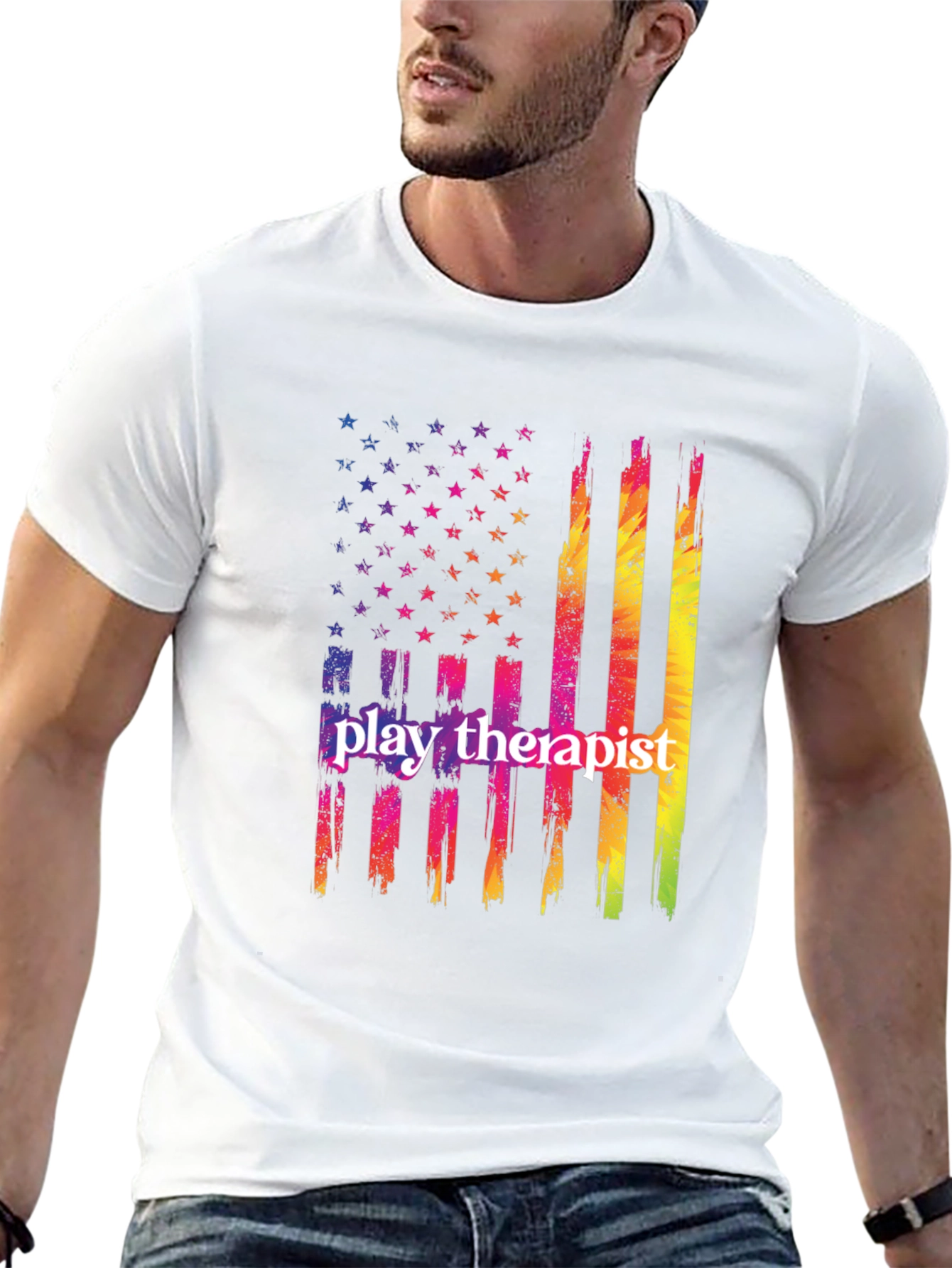Show your support with this stylish t-shirt! This black tee features a vibrant, distressed USA flag graphic, with colorful stars and stripes. Superimposed on the flag is the text 'play therapist'. Made from comfortable material, this shirt is perfect for casual wear, therapy sessions, or showing off your pride. A great gift for play therapists!