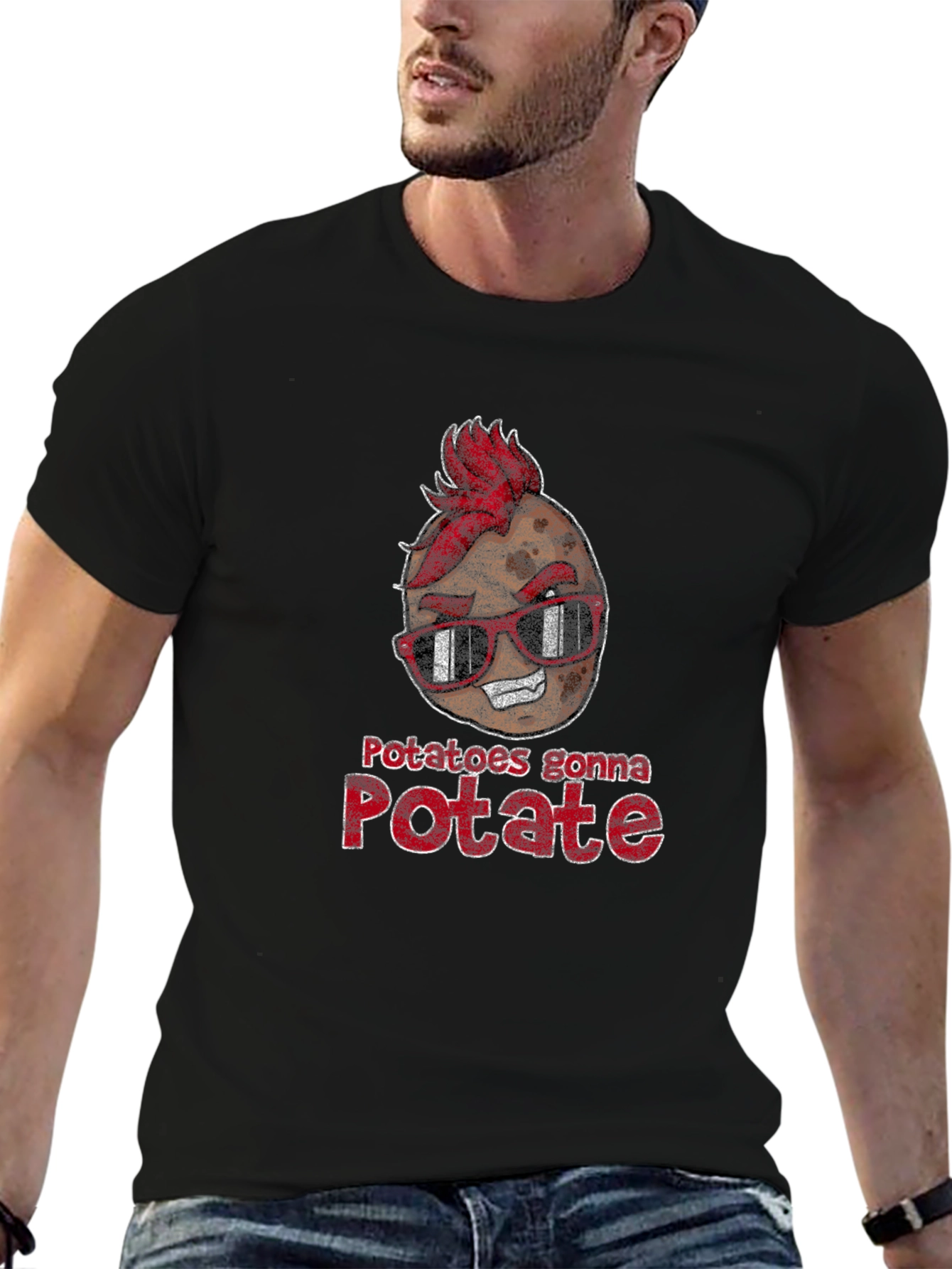 Express your quirky sense of humor with this eye-catching black t-shirt. Featuring a cool potato cartoon character with a red mohawk and shades, alongside the playful slogan "Potatoes gonna Potate", this tee is sure to turn heads. The design is printed with a slightly distressed, vintage effect. Made from comfortable, breathable fabric, this tee is perfect for everyday wear, casual outings, or as a fun gift for the potato lover in your life. Make a statement with this unique and humorous tee!