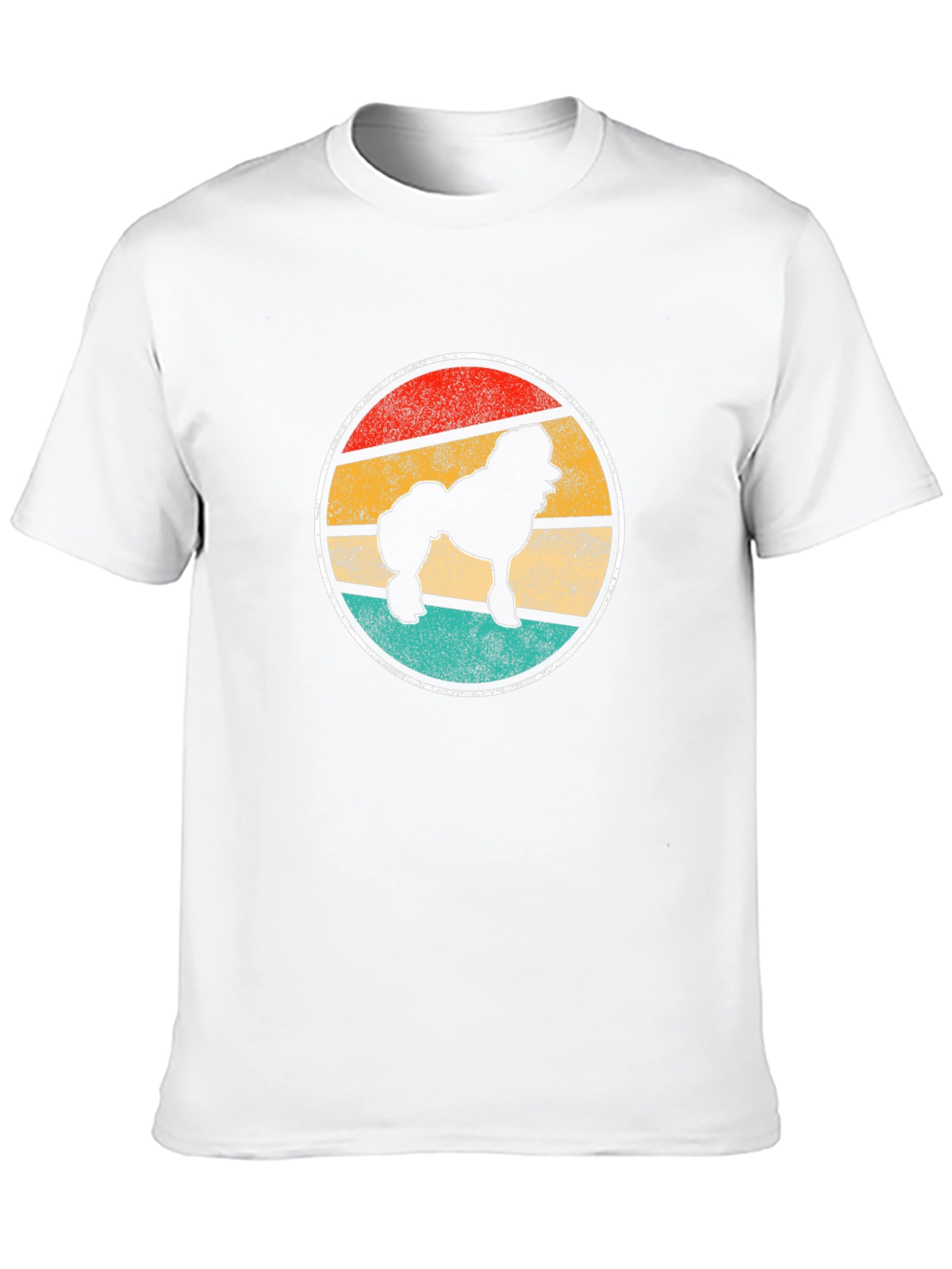 Show off your love for poodles with this stylish black T-shirt. Featuring a retro-inspired design, this shirt showcases a poodle silhouette set against a vibrant, circular backdrop with red, yellow, and teal stripes. The classic black color ensures versatility, making it easy to pair with jeans, shorts, or casual trousers. Crafted from a soft, comfortable fabric, this tee is perfect for everyday wear, dog walks, or casual outings. The eye-catching design is sure to make you stand out, and the comfortable fit ensures you'll stay relaxed all day long. Add a touch of vintage charm to your wardrobe with this unique poodle T-shirt.