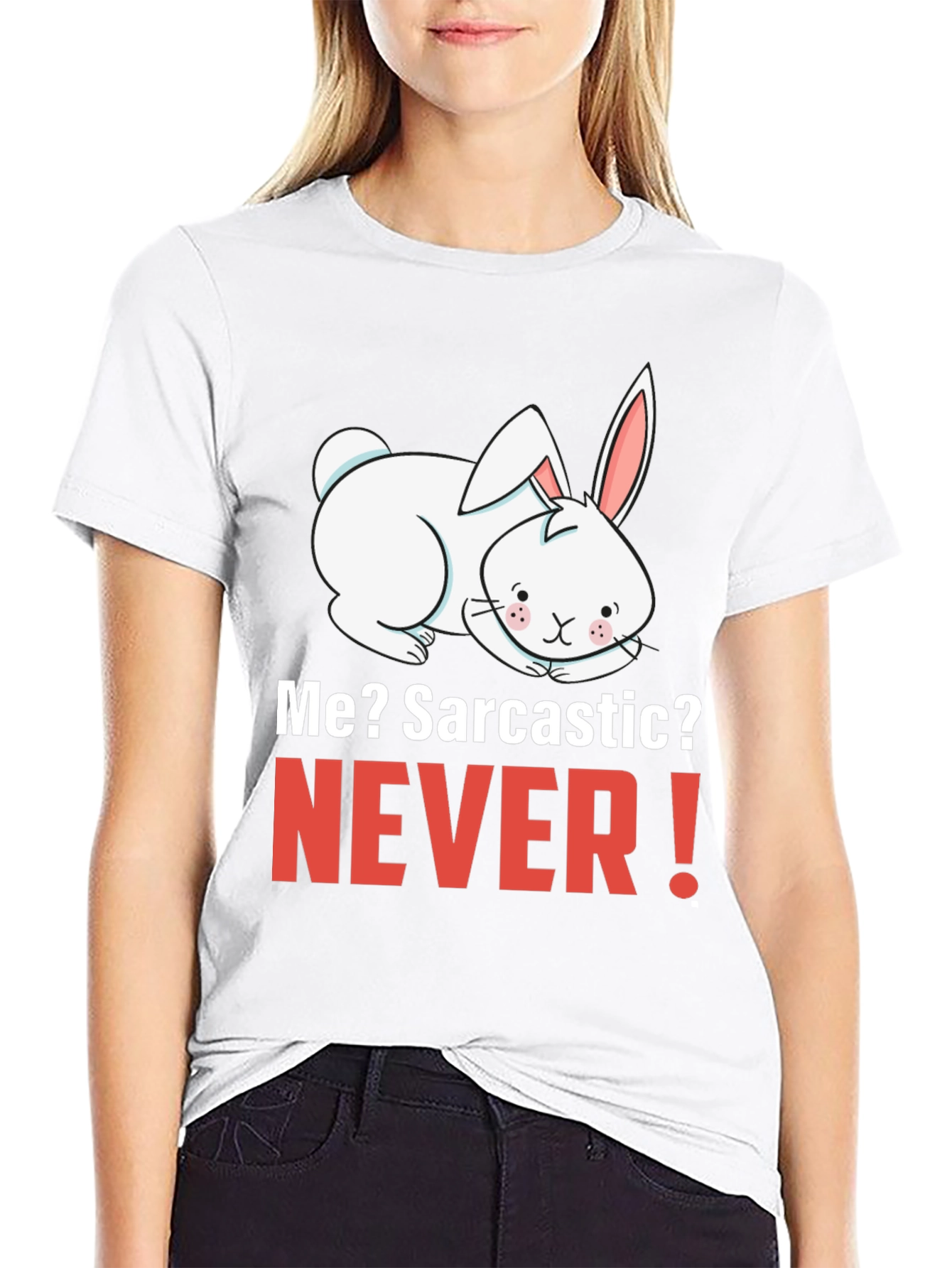 Express your humorous side with this eye-catching black t-shirt. The shirt features a cute, white cartoon bunny design paired with the witty phrase "Me? Sarcastic? NEVER!" in bold, contrasting red and white text. Made from comfortable, breathable fabric, this unisex tee is perfect for everyday wear. Show off your playful personality and start conversations wherever you go. This tee is an ideal gift for friends and family with a great sense of humor. Pair it with jeans or shorts for a casual, fun look.
