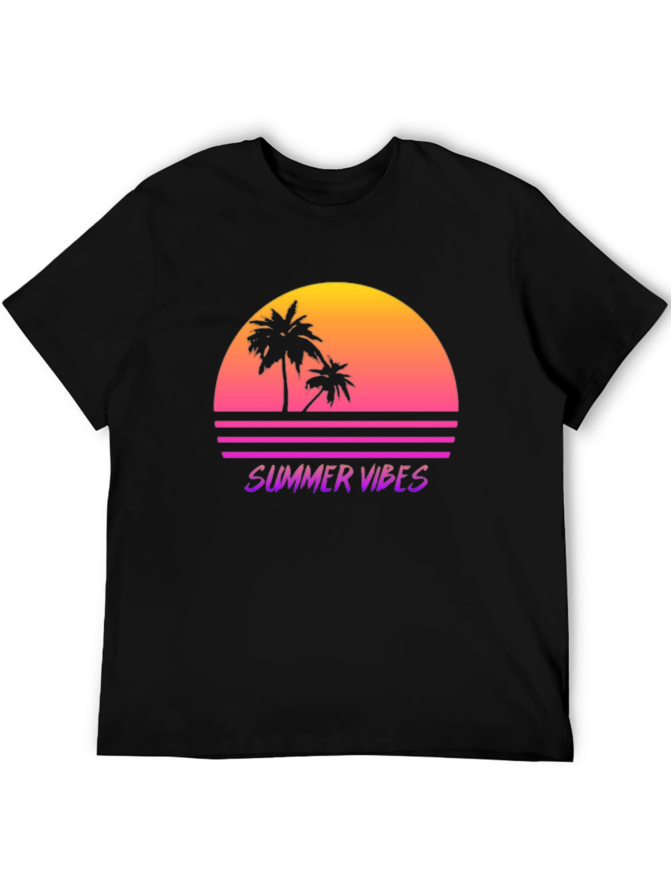Embrace the sun-soaked season with this stylish "Summer Vibes" t-shirt. The shirt features a retro-inspired sunset graphic with palm trees, radiating a nostalgic and carefree vibe. The design incorporates vibrant colors that transition from warm yellow to deep pink, complemented by bold text. Crafted from what appears to be soft, breathable cotton, this t-shirt ensures comfort during warm weather. Its classic fit and durable construction make it suitable for various casual occasions, from beach outings to summer parties. Pair it with your favorite shorts or jeans for an effortlessly cool look. Get ready to turn heads with this trendy piece!