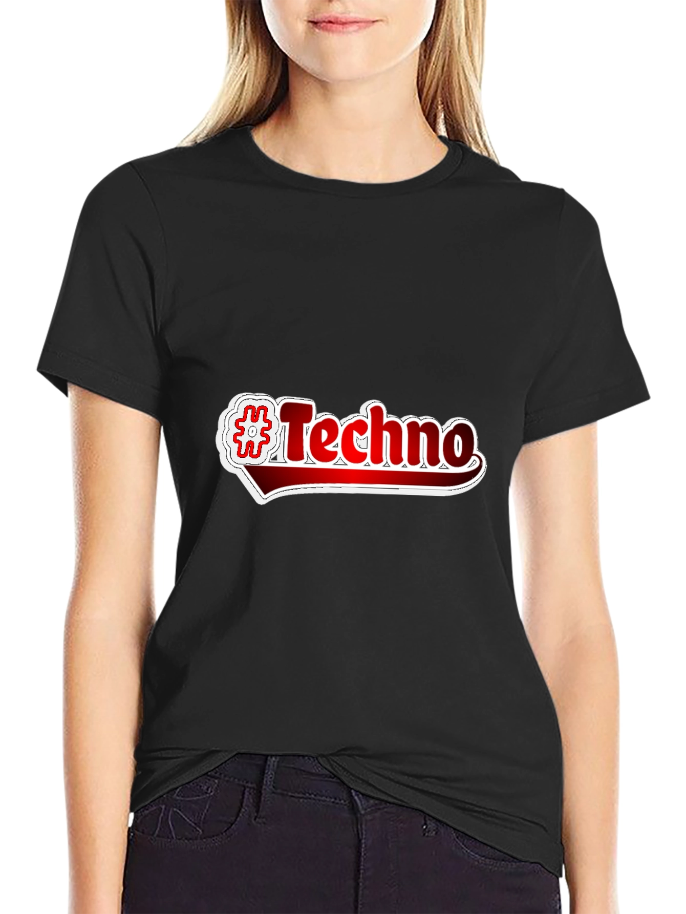 Show off your love for techno music with this stylish black T-shirt. The shirt features a bold '#Techno' graphic print, making it a standout piece for any music enthusiast. The design incorporates a hashtag symbol alongside the word 'Techno', creating a modern and trendy look. Crafted from a comfortable fabric, this T-shirt is perfect for casual wear, music events, or everyday style. Pair it with jeans or shorts for a relaxed yet fashionable outfit. Make a statement and express your passion for techno music with this unique graphic tee.