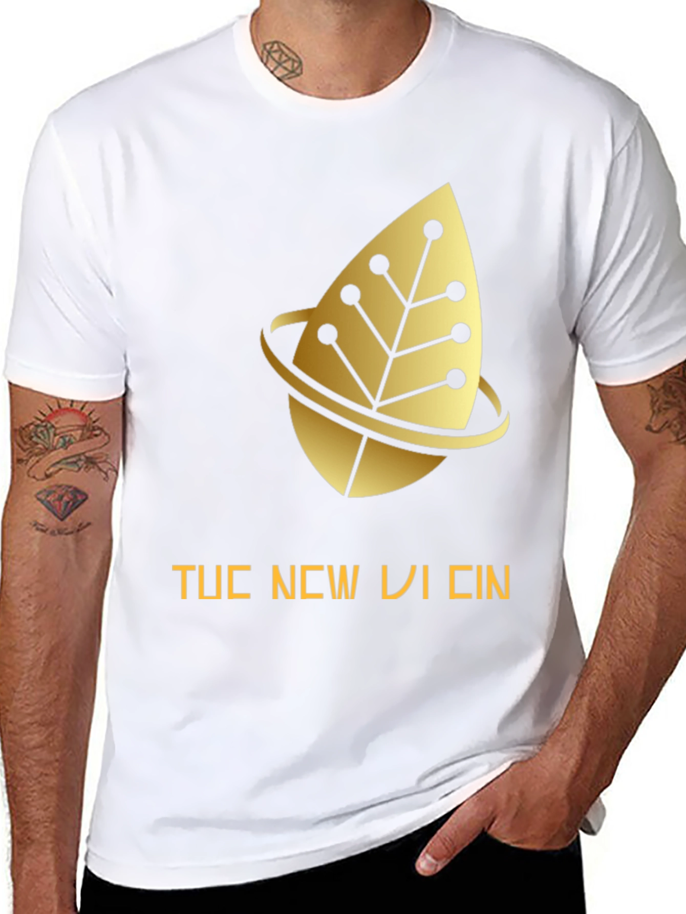 Showcase your forward-thinking style with The New Vicin T-shirt. This striking black tee features a bold, golden logo that blends nature and technology: a leaf adorned with digital nodes, encircled by a symbolic ring. Crafted from a comfortable material, this t-shirt is perfect for casual wear or making a statement at tech events. The vibrant gold print contrasts beautifully against the dark fabric, ensuring you stand out in any crowd. The unique design sparks conversation and reflects your innovative spirit. Upgrade your wardrobe with this eye-catching piece and embody the fusion of nature and progress.