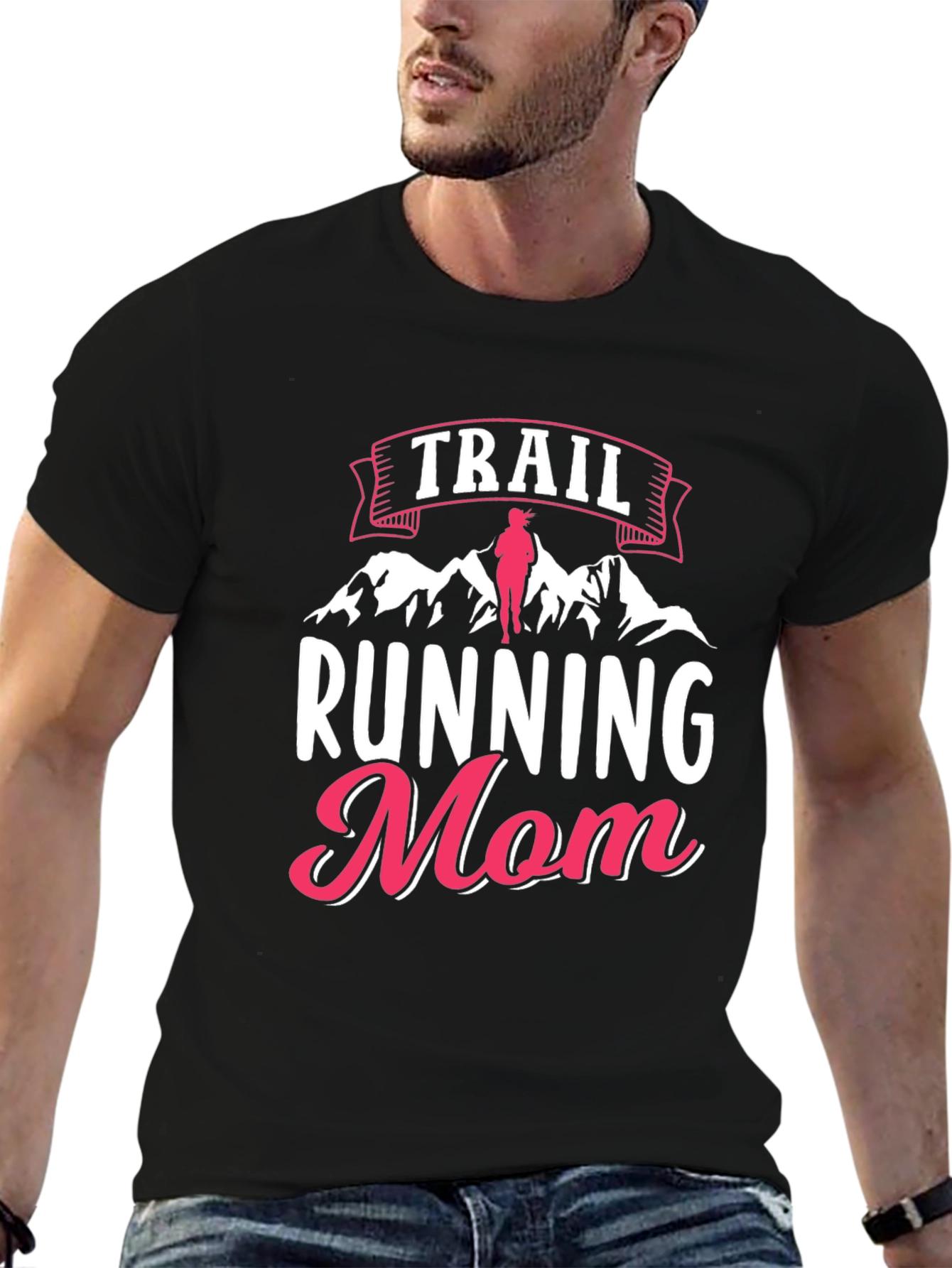 Show your love for trail running with this stylish black t-shirt. The shirt features a unique design with the words "Trail Running Mom" displayed prominently. "Trail" is in pink text over a white banner with pink accents, "Running" is in white and "Mom" is in pink with a white outline. An image of mountains with a female trail runner in pink is displayed between "Trail" and "Running". The shirt appears to be made of a comfortable, breathable fabric, perfect for outdoor activities or casual wear. It's an ideal gift for any mom who enjoys hitting the trails and staying active. Perfect for casual wear or outdoor activities.