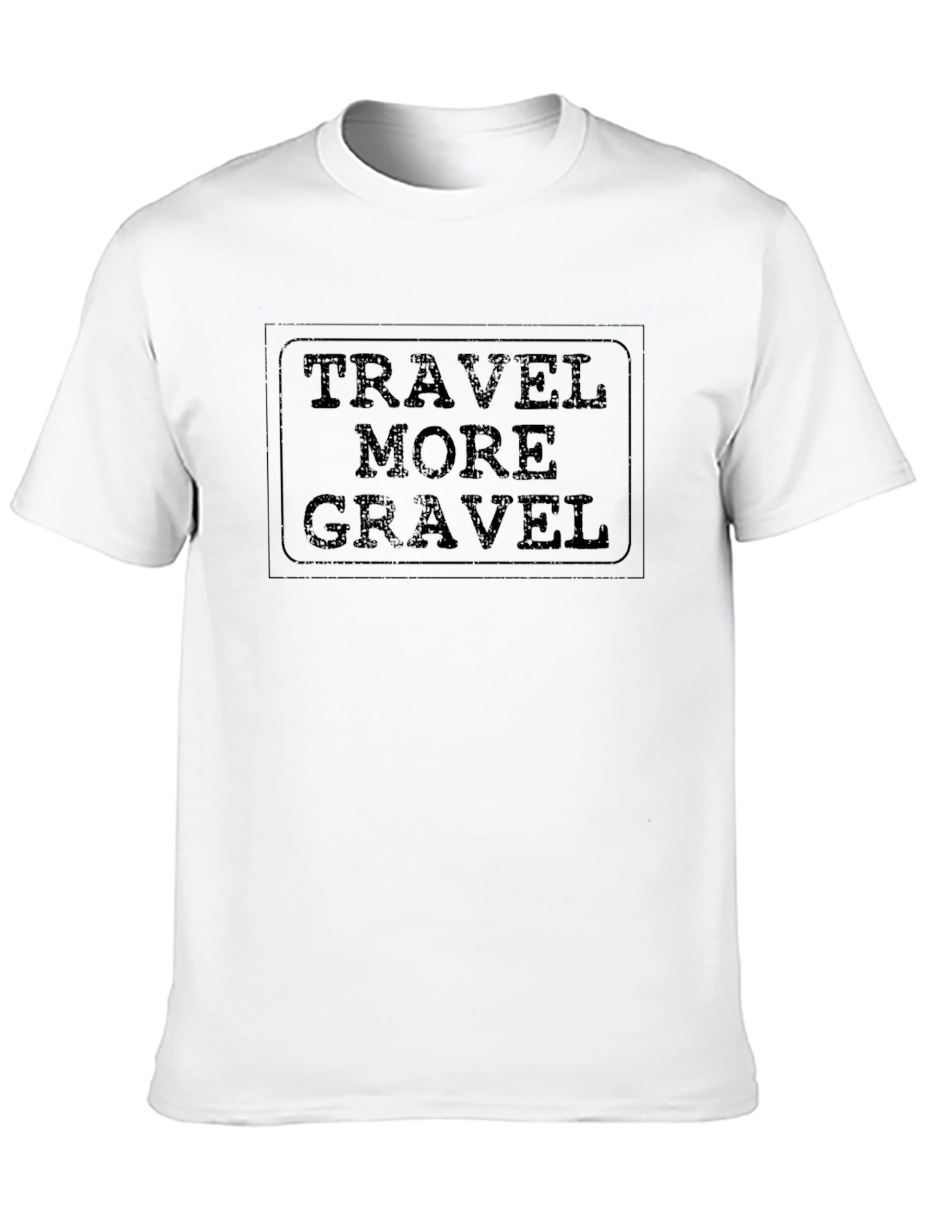 Embark on your next adventure with this classic black t-shirt. Boldly displaying "Travel More Gravel" across the chest, this tee is designed for comfort and style. The dark print stands out, making a statement. Perfect for casual wear or outdoor activities, this durable shirt is ready for any journey. Pair it with your favorite jeans or shorts for a versatile look that showcases your adventurous spirit. A must-have addition to any wardrobe for those who love to explore off the beaten path!