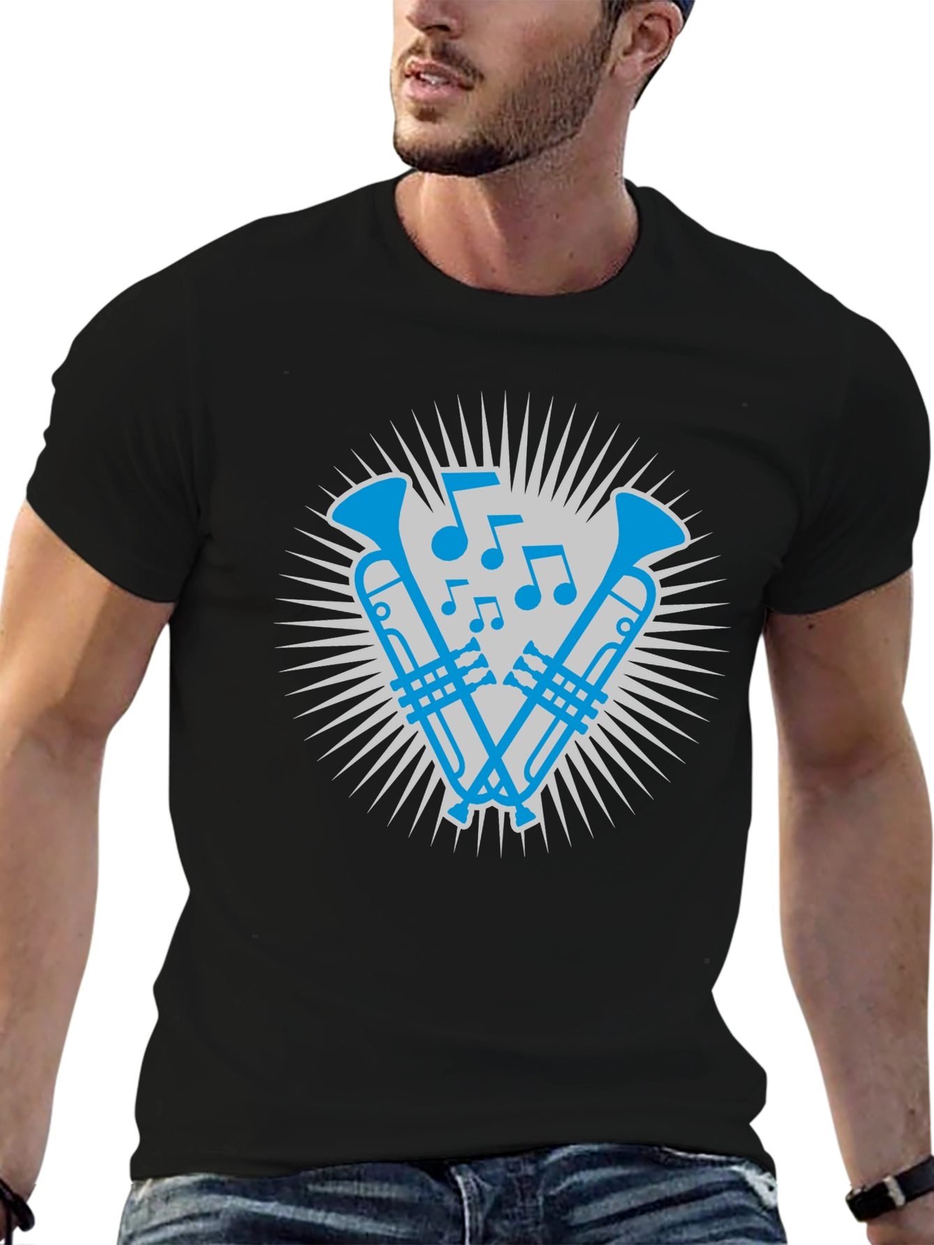 Rock your music style with this classic black T-shirt featuring a unique trumpet and music notes graphic. The eye-catching blue design is set against a burst of radiating lines, ensuring you'll stand out in any crowd. Made from a comfortable fabric, this tee is perfect for everyday wear, music events, or casual hangouts. Show off your passion for music and add a touch of artistic flair to your wardrobe with this distinctive graphic tee. Ideal for musicians, music lovers, or anyone who appreciates a bold and stylish design.