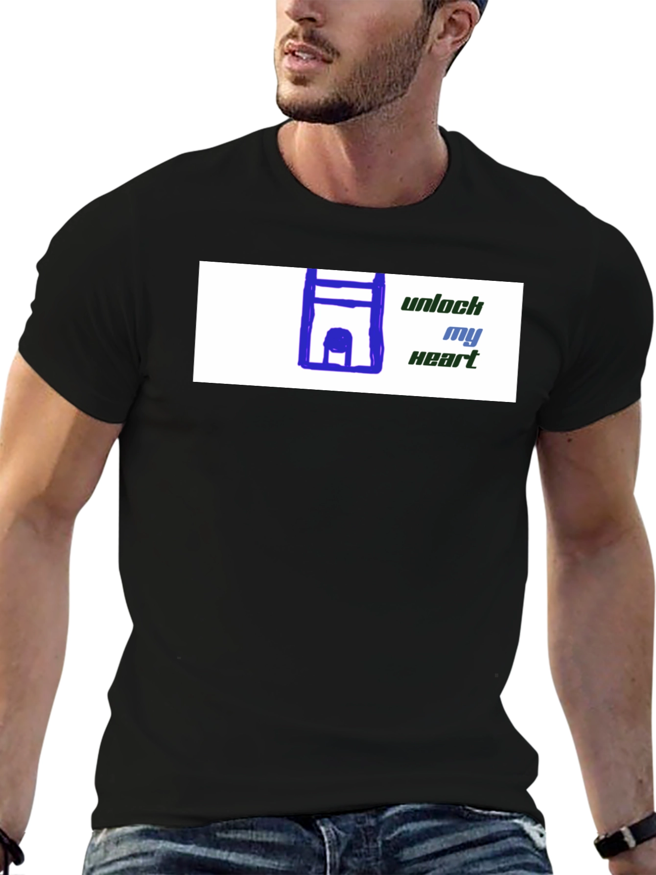 This sleek black t-shirt features a unique graphic design, perfect for expressing your individuality. The design includes an eye-catching image paired with the text "unlock my heart", suggesting themes of love, openness, or personal growth. The shirt appears to be made from a comfortable, breathable fabric, ideal for everyday wear. Its classic cut and dark color make it versatile for various occasions, from casual outings to creative social gatherings. This t-shirt is an excellent way to showcase your personality and start conversations.
