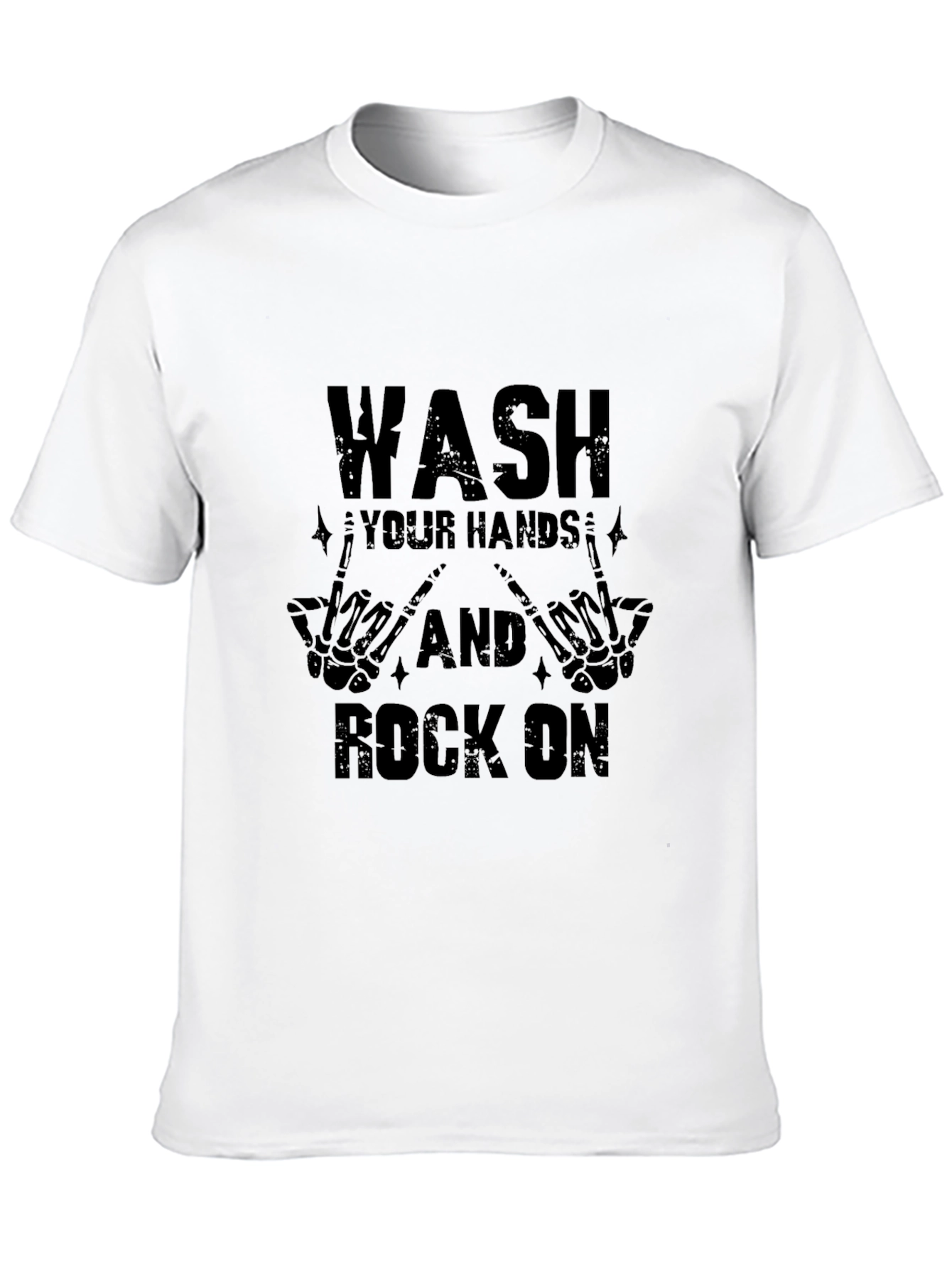 Rock out while staying safe with this bold black graphic tee! The shirt features the statement "Wash Your Hands and Rock On" in a distressed, edgy font, accompanied by skeleton hand illustrations giving the rock and roll sign. This t-shirt appears to be made from comfortable material and has a classic fit. Perfect for music lovers with a sense of humor, this tee is great for concerts, casual outings, or just expressing your unique style. Show off your love for rock while promoting hygiene! Get yours today!