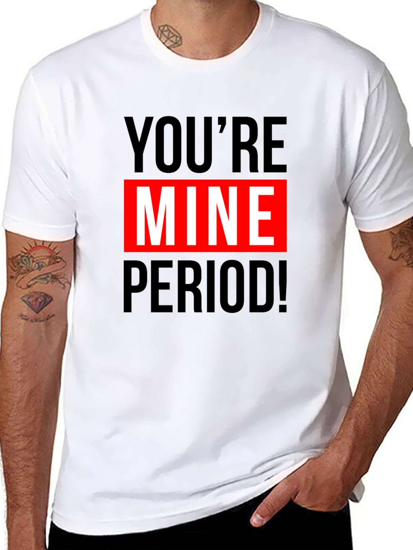 Make a statement with this bold black t-shirt featuring a playful graphic design. The text "YOU'RE MINE PERIOD!" is prominently displayed, with the word "MINE" set against a vibrant red background. This eye-catching design adds a touch of confidence and humor to your everyday wardrobe. Crafted from a comfortable, breathable fabric, this tee offers a relaxed fit that's perfect for casual wear. Pair it with jeans, shorts, or your favorite bottoms for an effortlessly cool look. Whether you're hitting the streets, hanging out with friends, or simply expressing yourself, this t-shirt is sure to turn heads and spark conversations.